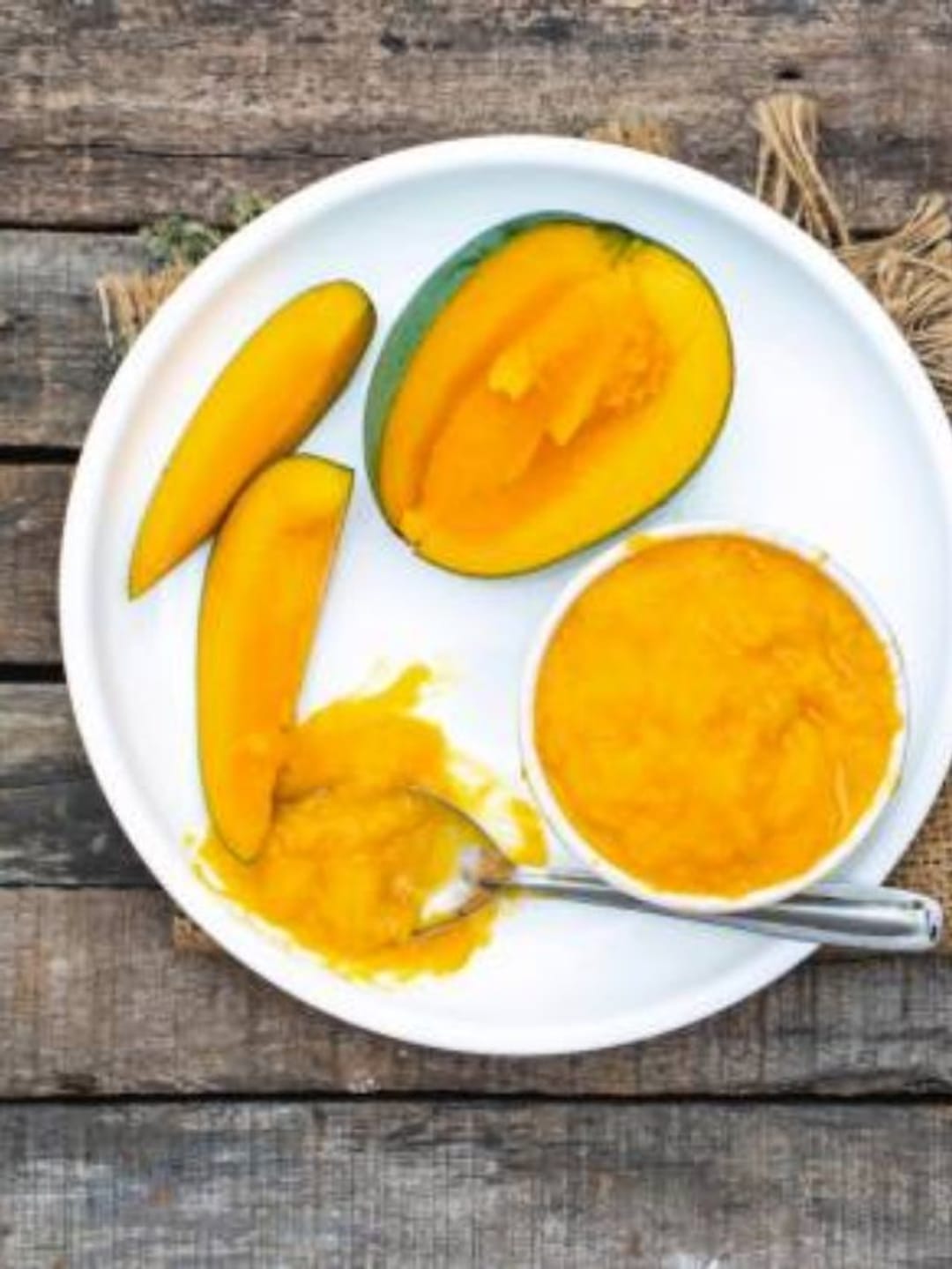 এবার এর মধ্যে আমের পিউরি মিশিয়ে দিন আর হাফ কাপ তুলে রাখুন