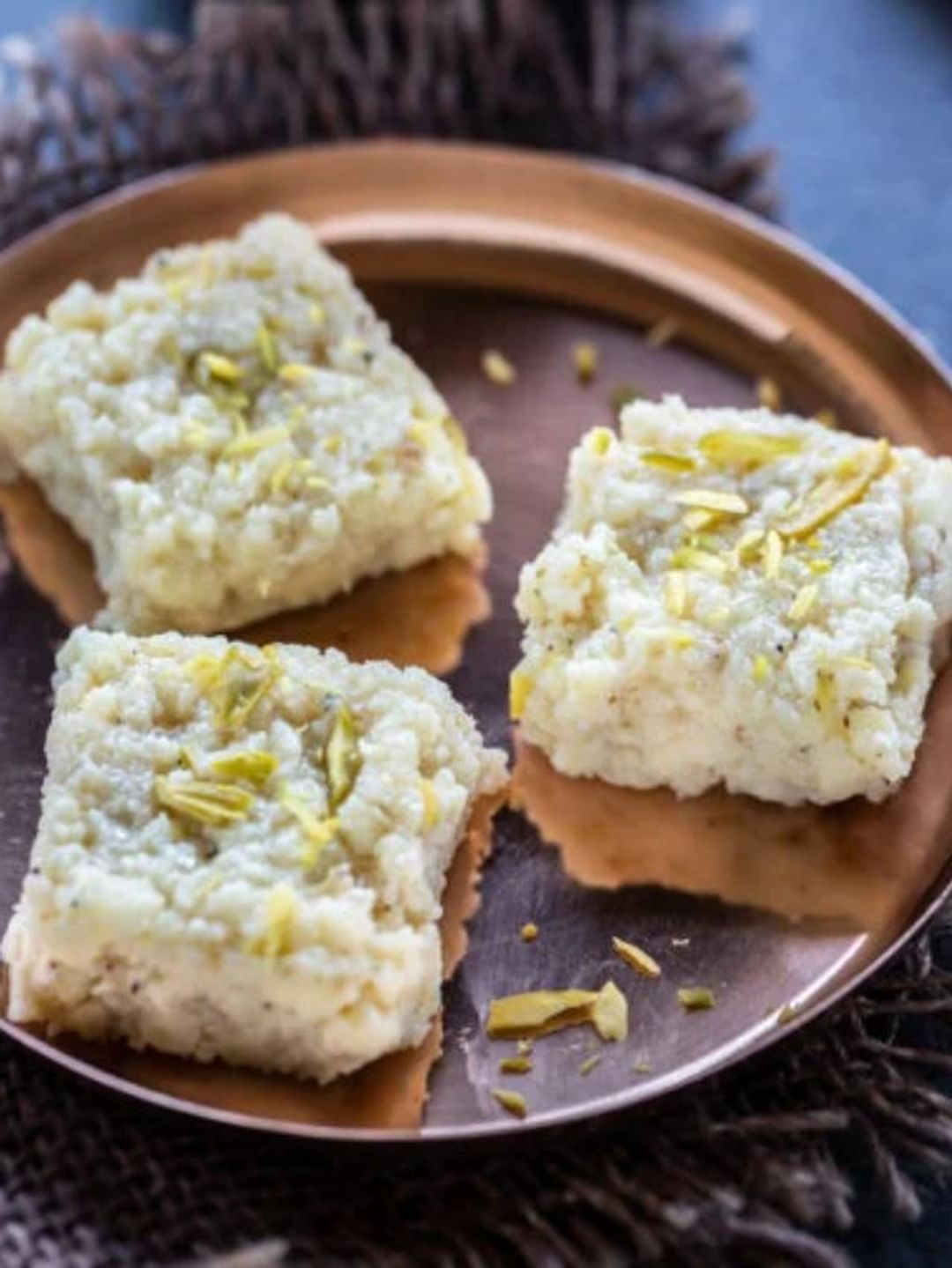 প্যানে মিশ্রণের পাক তৈরি হয়ে গেলে গ্যাস বন্ধ করে দিন। এবার একটা থালায় একটু বেশি পরিমাণে ঘি ব্র্যাশ করে নিন।