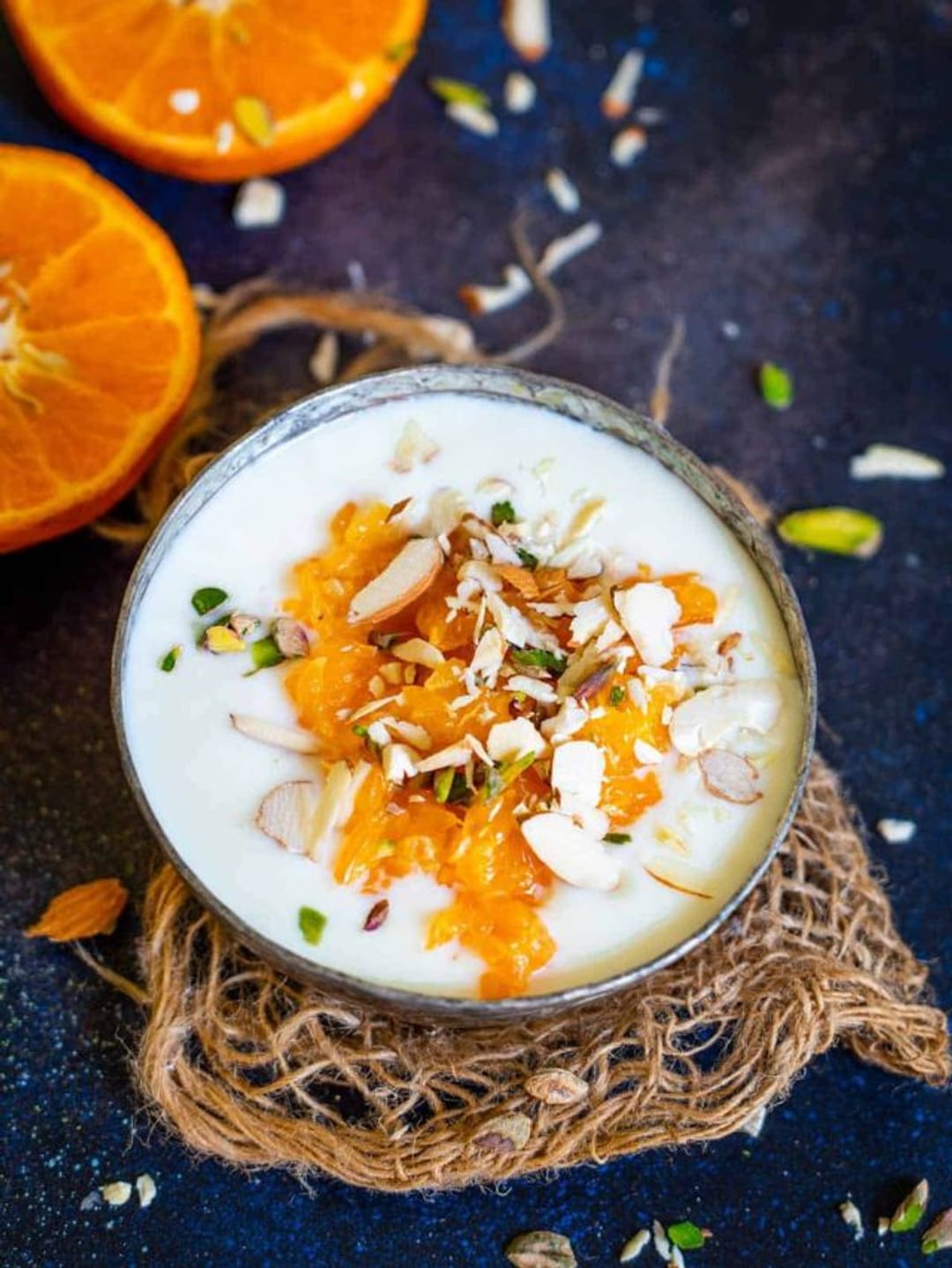 উপর দিয়ে ছড়িয়ে দিন কুচানো কাজু, আমন্ড ও কিশমিশ। তৈরি কমলালেবুর ক্ষীর। ডেজার্টে খেতে পারেন সুস্বাদু কমলালেবুর ক্ষীর।
