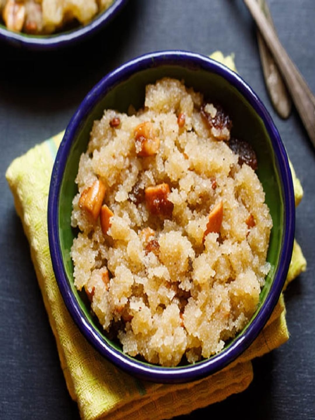 এবার নামিয়ে নিয়ে উপর থেকে কাজু-কিশমিশ ছড়িয়ে দিলেই তৈরি হালুয়া।