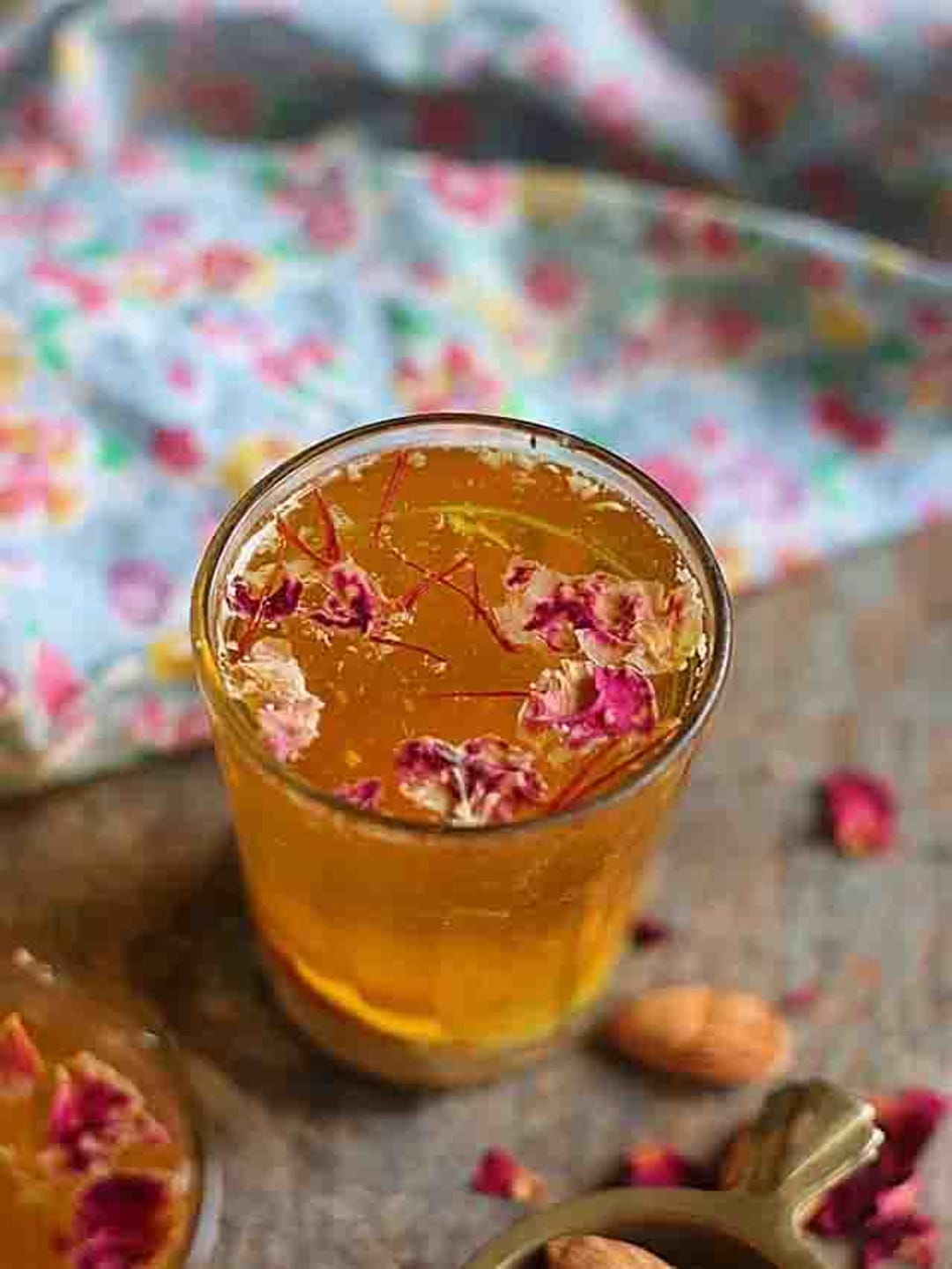 এতে মিশিয়ে দিন কয়েকটা জাফরান আর শুকনো গোলাপের পাপড়ি।