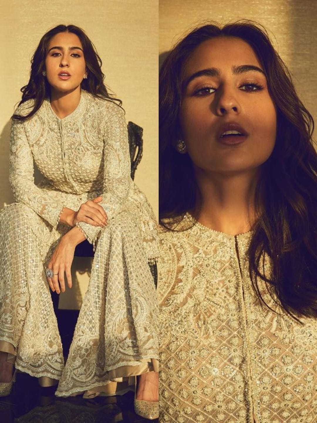 সারাকে আইভরি রঙের শারার সেটে অপূর্ব লাগছে