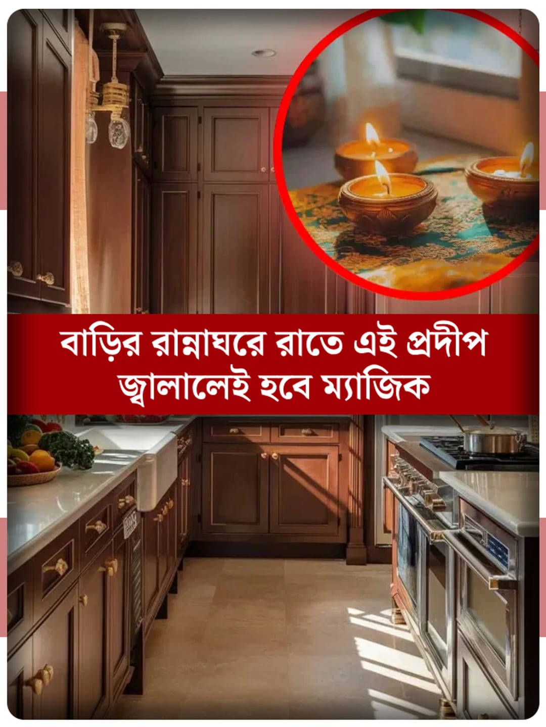 বাস্তুশাস্ত্র মতে, প্রতিদিন রান্নাঘরে যদি তেলের প্রদীপ জ্বালানো হয়, তা হলে সেই বাড়ি থেকে নেতিবাচক শক্তি দূরে থাকে। এবং ইতিবাচক শক্তি আকর্ষিত হয়।