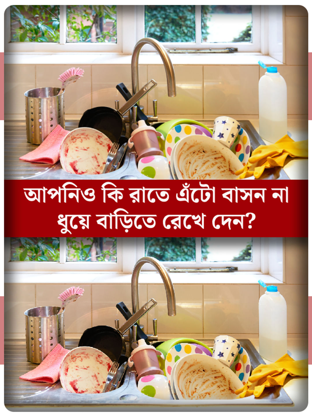 বাস্তুশাস্ত্র মতে, যদি কেউ রাতে এঁটো বাসন রান্নাঘরে রাখেন, তা হলে সেই ব্যক্তির জীবনে দুর্ভাগ্য বয়ে আসে।