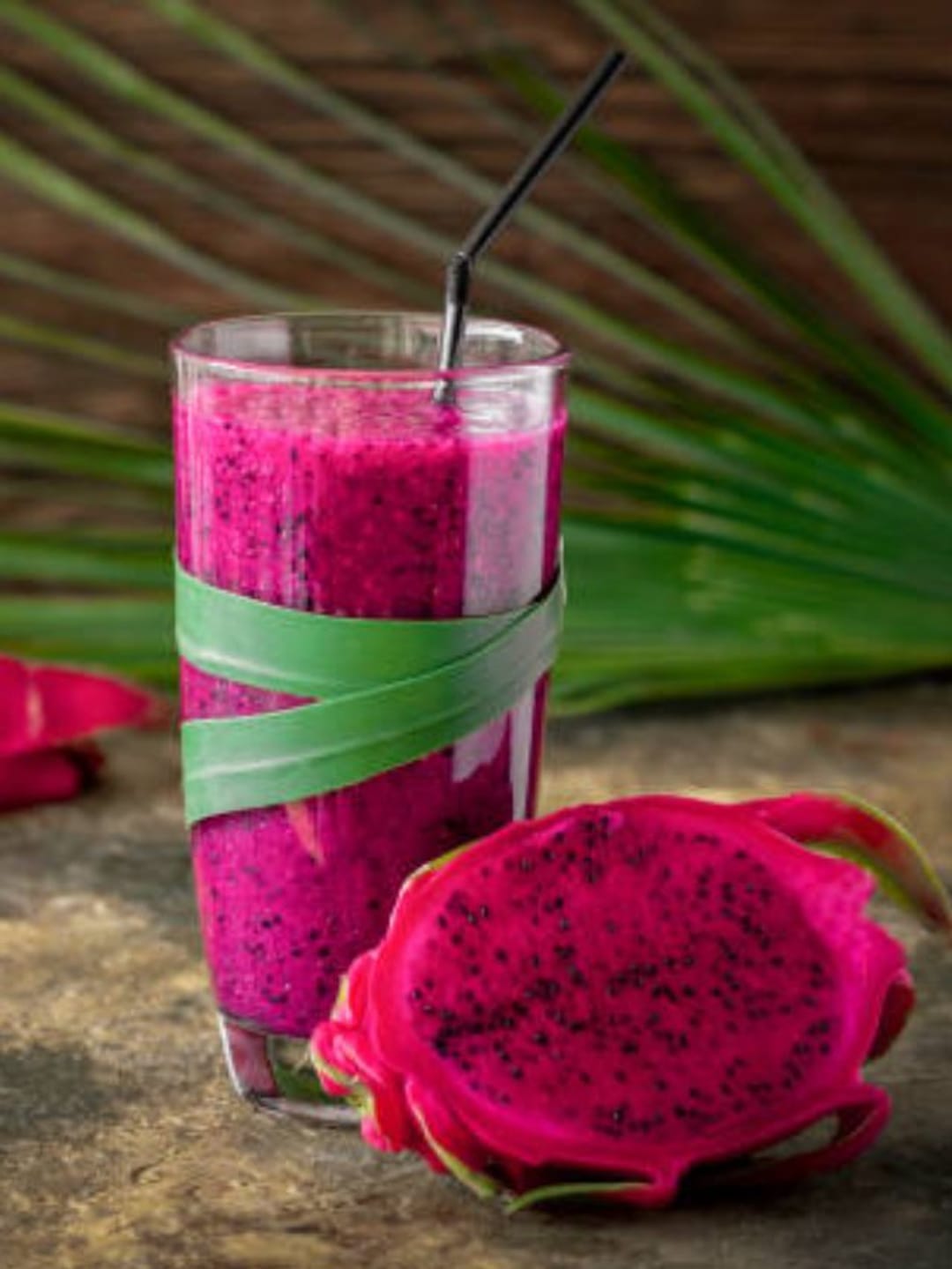 ১ গ্লাস ড্রাগন স্মুদি বানাতে লাগবে ১টি ড্রাগন ফল, ২ চামচ বেদানার দানা, ১টি পাকা কলা, আধ কাপ দই, সিকি কাপ দুধ ও ২ চামচ মধু।