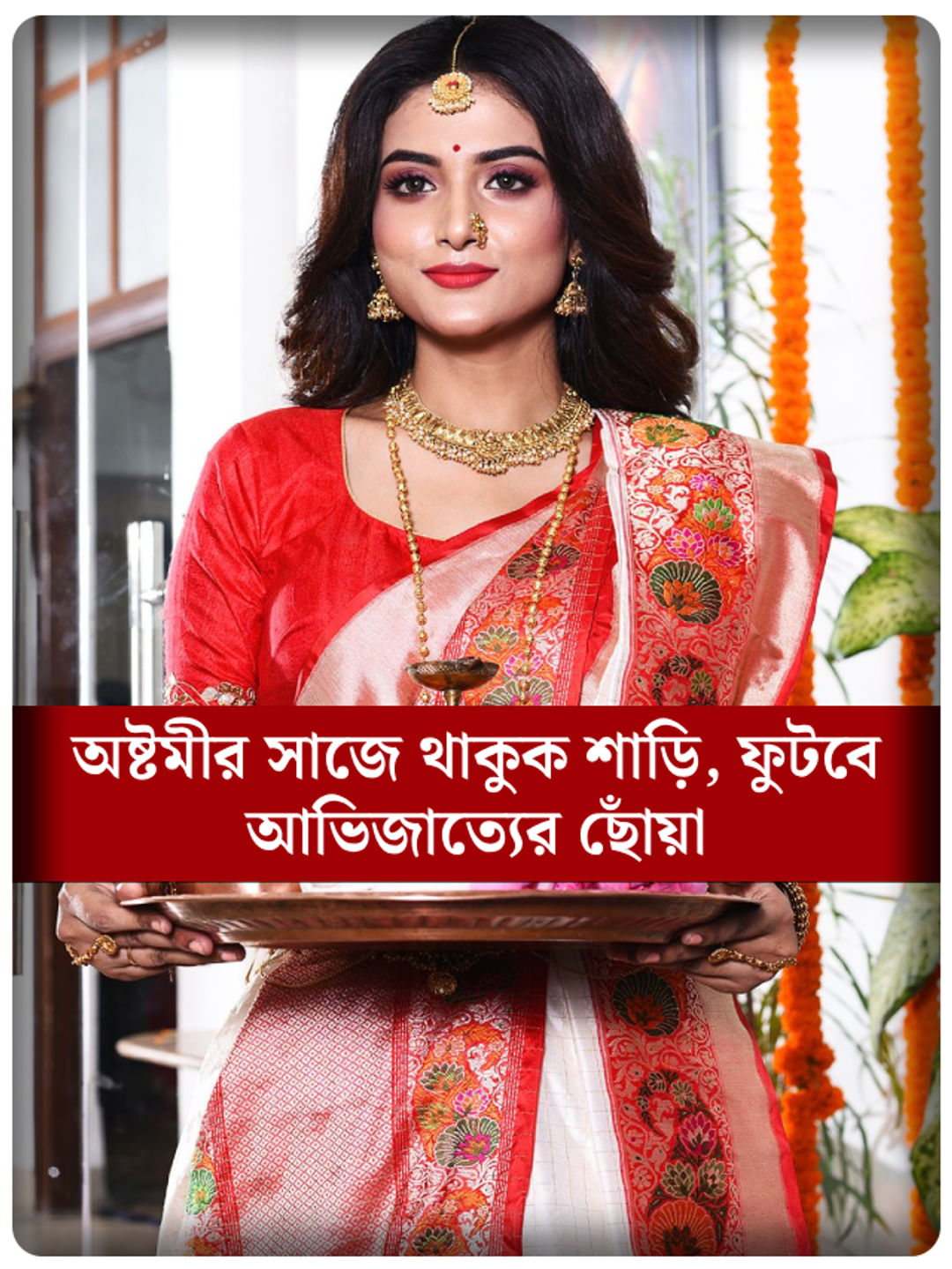 দুর্গাপুজোর অষ্টমী মানেই সবার চোখে নতুন সাজ, বিশেষ করে শাড়ি। ঐতিহ্য আর আধুনিকতার মেলবন্ধনে শাড়ি পরলে আলাদা এক সৌন্দর্য ধরা দেয়।
