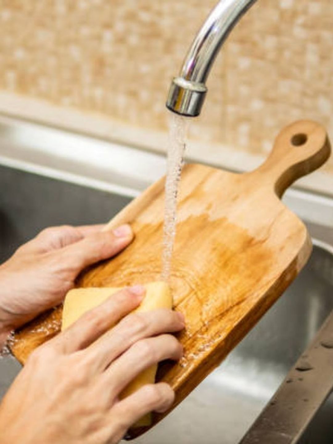 জলের সঙ্গে তরল সাবান ও নুন মিশিয়ে নিন। এতে চপিং বোর্ড ভিজিয়ে রাখুন। তারপর স্পঞ্জ দিয়ে ঘষে পরিষ্কার করে নিন চপিং বোর্ড।