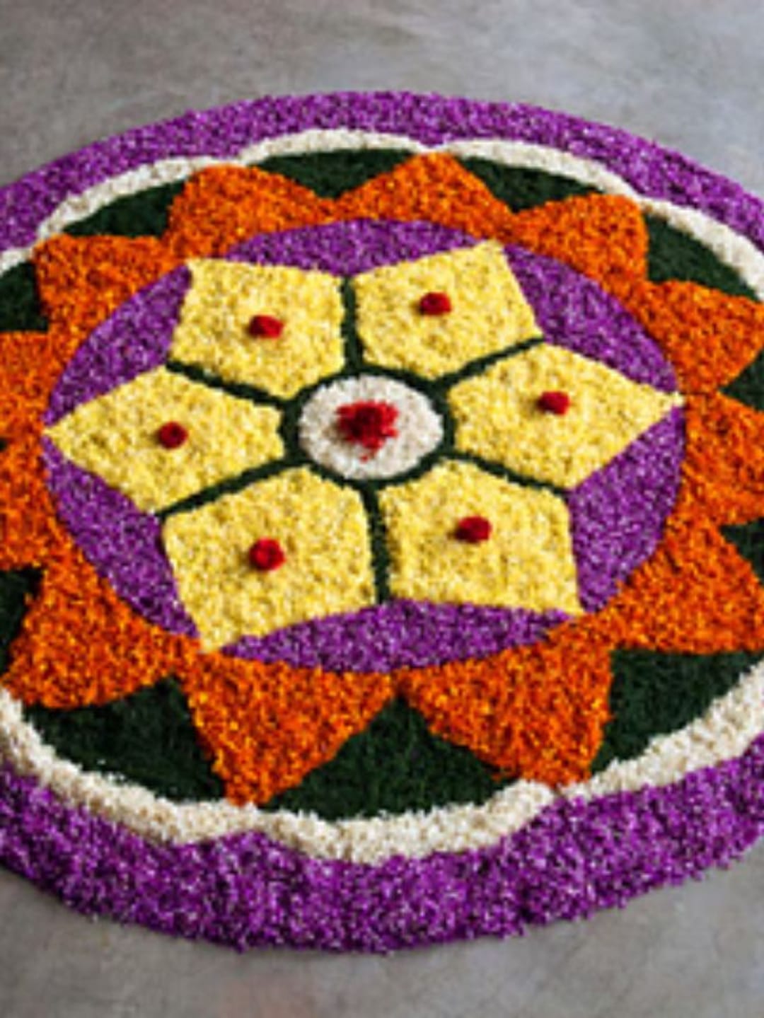 কেবল পদ্মই নয়, বিভিন্ন ফুলের আকারেও বানাতে পারেন রঙ্গোলি। যাঁরা নতুন নতুন রঙ্গোলি দিতে শিখেছেন তাঁদের জন্য এই নকশা বেশ সহজ। প্রয়োজনে আগে চক দিয়ে এঁকে নিতে পারেন, সুবিধা হবে।