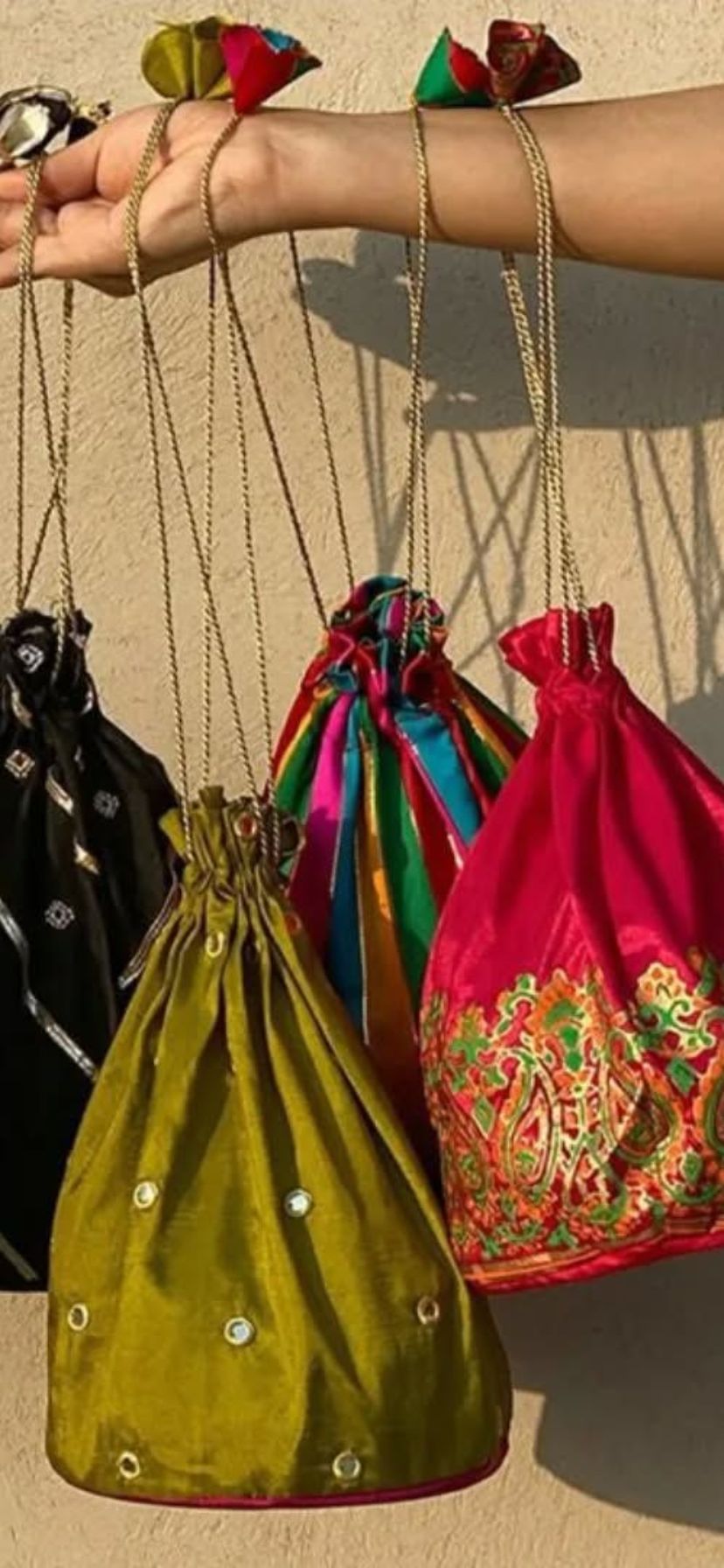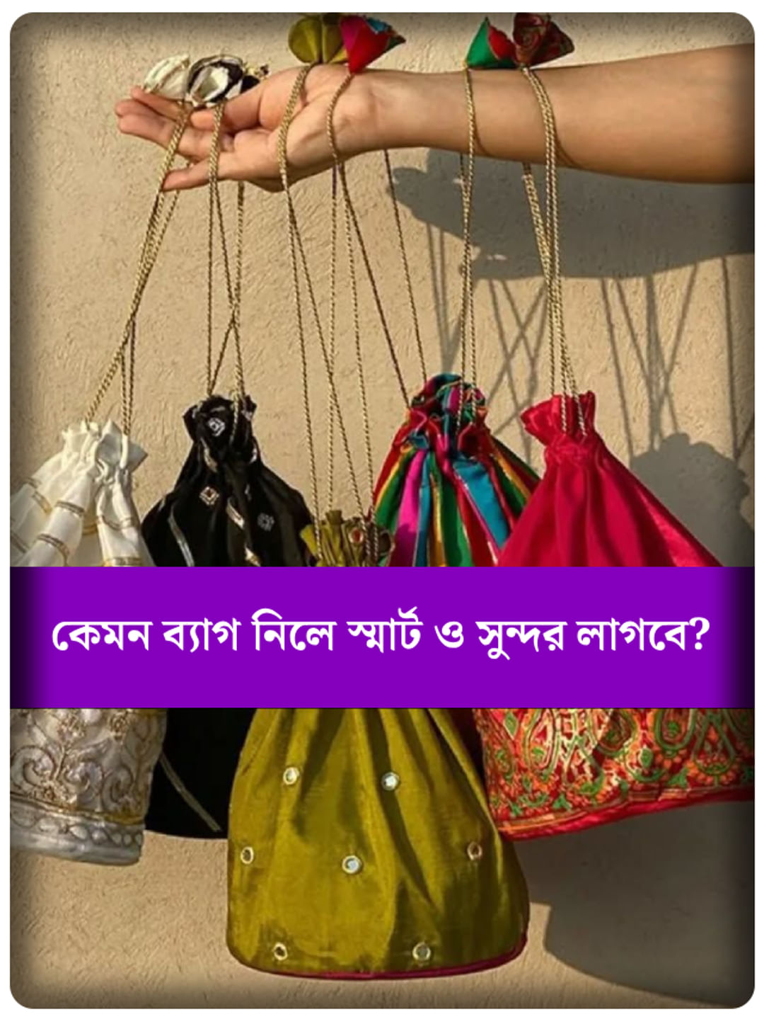 এমব্রয়ডারি বা ঝলমলে পটলি ব্যাগ শাড়ির সঙ্গে একেবারে রাজকীয় আভা দেয়। বিয়ে বা রিসেপশনে দারুণ মানায়। পাশাপাশি পুজোতেও অসাধারণ লুক দেয়।