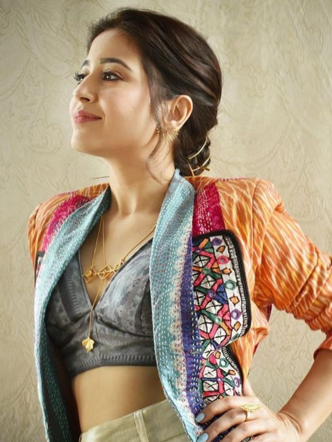 শ্বেতাকে প্রিন্টেড কোট, প্যান্ট ও ব্র্যালেটে দেখা গিয়েছে ছবিতে