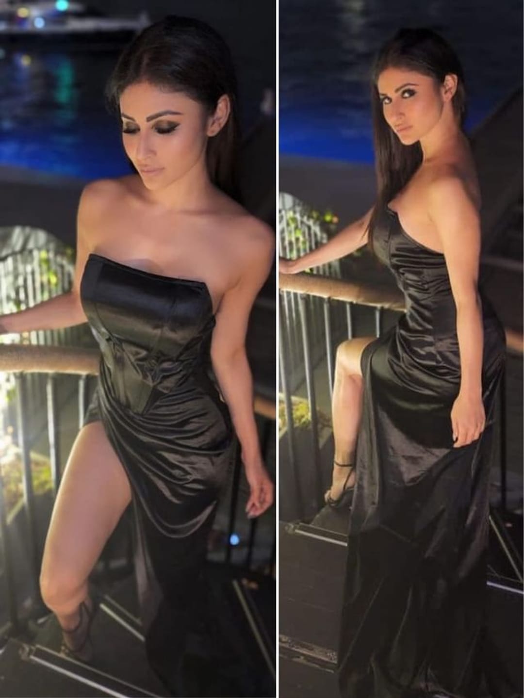 মৌনি রায় একটি কালো পা খোলা গাউন ছবি দিয়েছেন।