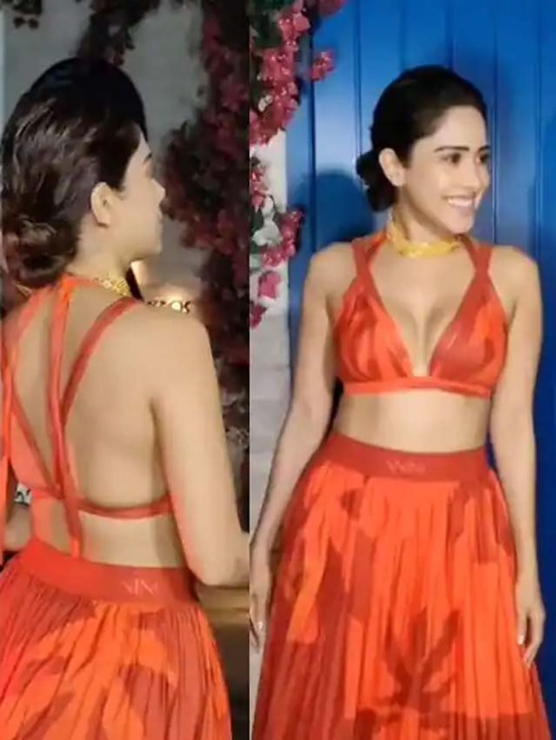 নুসরৎ তাঁর ৩৭তম জন্মদিনের পার্টিতে কমলা রঙের পোশাকের সঙ্গে লোনার নেকলেসে সেজেছিলেন।