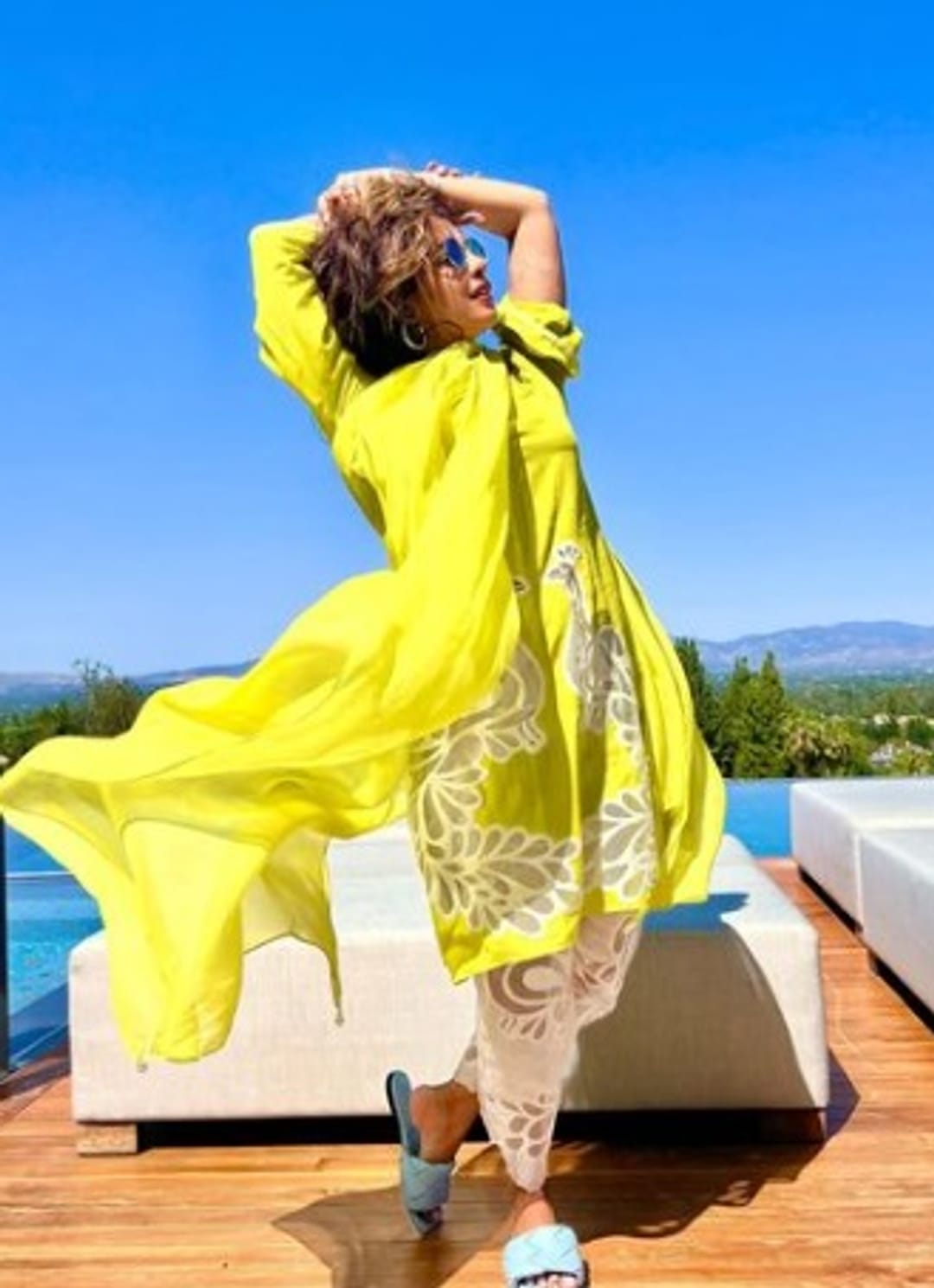 লেমন রংয়ের সালোয়ার পরে সূর্যকে আলিঙ্গন করতে দেখা যায় তাঁকে...