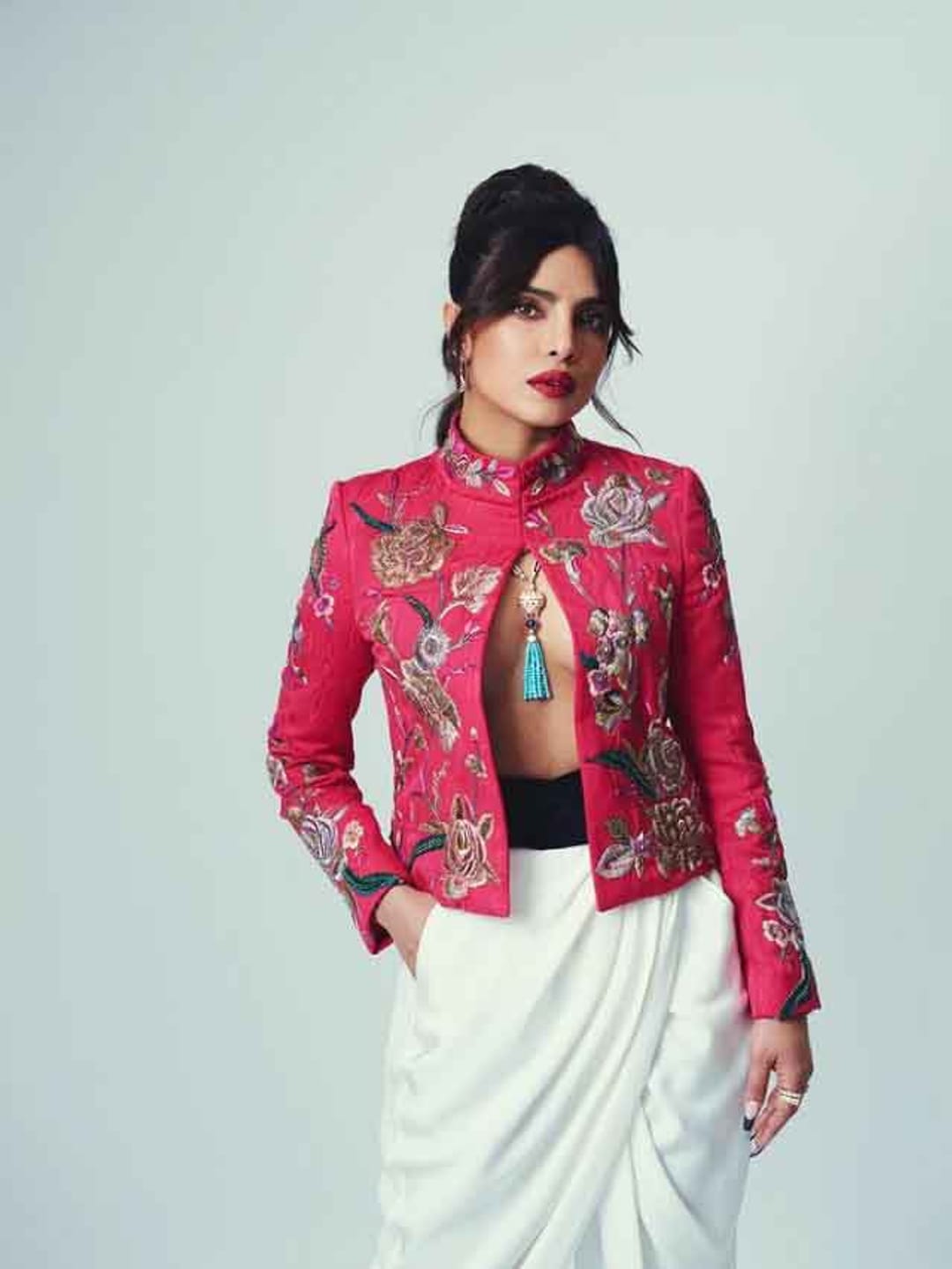 ফুশিয়া পিঙ্ক রঙের জ্যাকেটে বোল্ড লুকে দেখা গিয়েছে পিগি চপসকে।