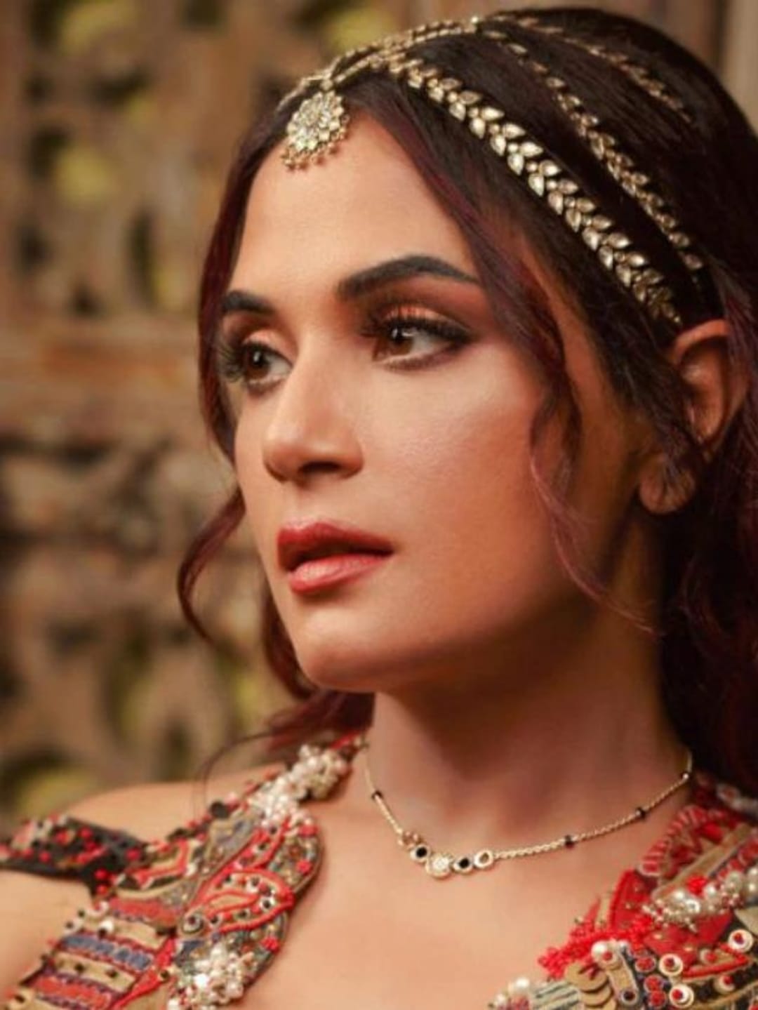 প্রাচ্য ও পাশ্চাত্যের সং মিশ্রণেতৈরি সুন্দর ডিজাইন করা হিরে ও সোনার তৈরি মঙ্গলসূত্র বেছে নিয়েছেন রিচা।