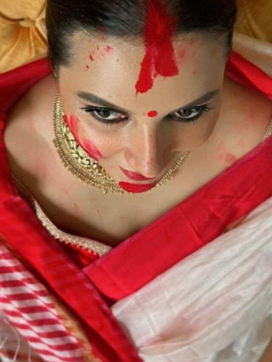 একগুচ্ছ ছবি শেয়ার করেছেন নায়িকা। লাল পাড় সাদা শাড়িতে তারত রূপ দেখে অবাক হতেই হয়। শুধু যে সিঁদুর খেলেছেন তা কিন্তু নয়। মা'কে বরণ করতেও দেখা গিয়েছে তাঁকে।