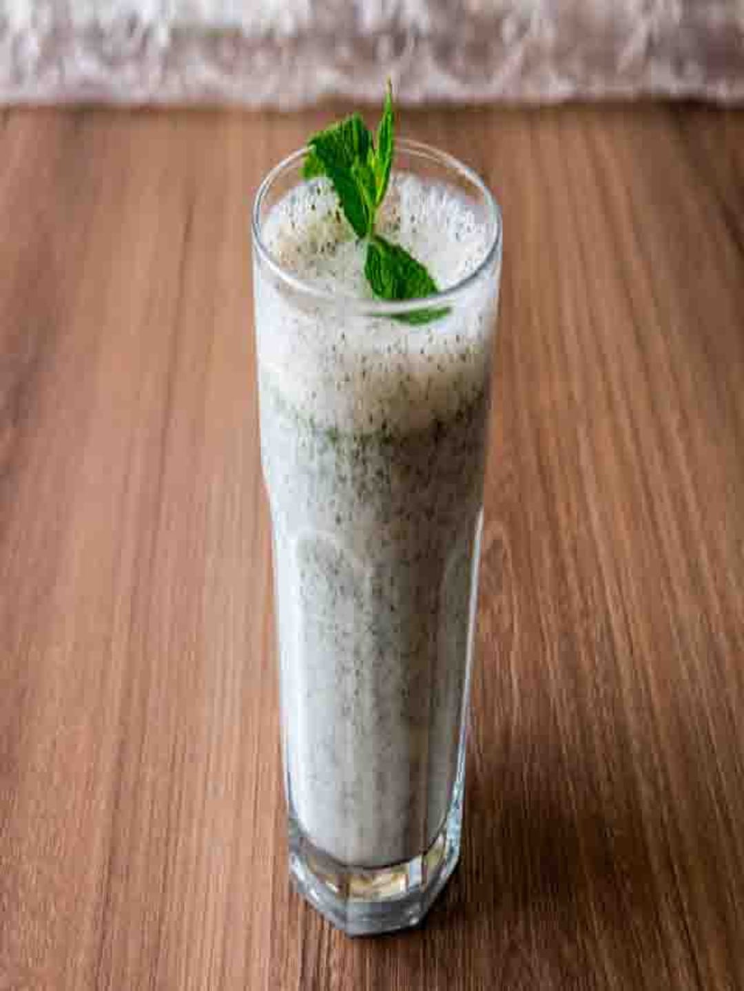 শেষে বরফ কুচি আর পুদিনা পাতা ছড়িয়ে পরিবেশন করুন লস্যি