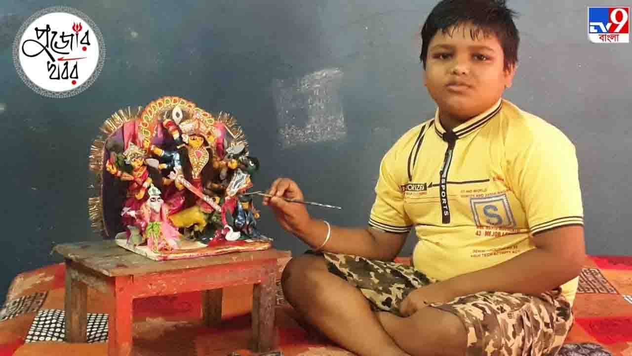 আলিপুরদুয়ার: করোনার জন্য বন্ধ স্কুল। পড়াশোনার সেভাবে চাপ নেই। তাই অবসর সময়ে ছবি আঁকা, হাতের কাজেই মন দিয়েছিল চতুর্থ শ্রেণির দীপ। এইভাবেই ধীরে ধীরে সে বানিয়ে ফেলেছে আস্ত একচালার দুর্গাপ্রতিমা। ভাবছেন নিশ্চই মাপে অনেক বড় সেই মূর্তি? একদমই নয়। বরং, ক্ষুদ্রতম বললেও অত্যুুক্তি হবে না। হ্যাঁ, মাত্র আট ইঞ্চির দুর্গাপ্রতিমা বানিয়ে নজির গড়েছে এই খুদে।