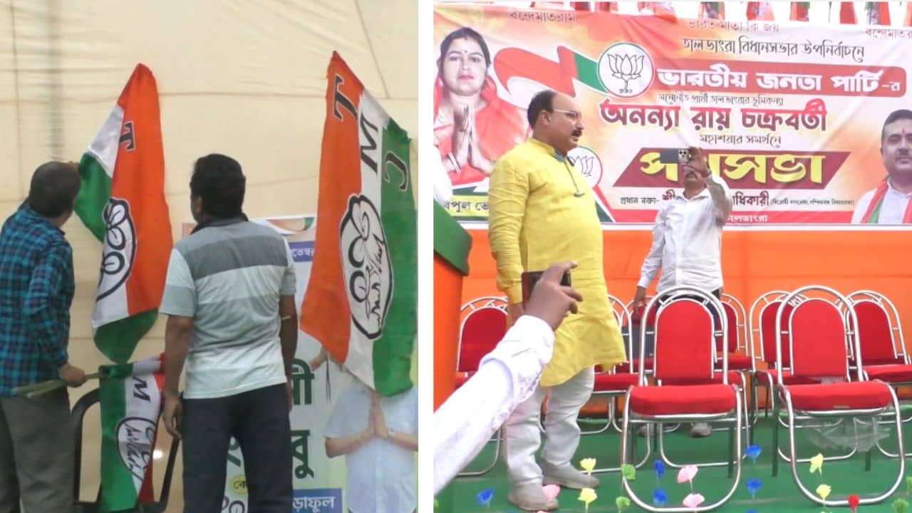 তালডাংরা: উপ নির্বাচনের শেষ লগ্নে উত্তেজনার পারদ চড়ল বাঁকুড়ার তালডাংরায়। বিধানসভার বিরোধী দলনেতা শুভেন্দু অধিকারী সভা করে মঞ্চ থেকে নামতেই সেই মঞ্চের দখল নিল তৃণমূল। মুহূর্তেই বদলে গেল মঞ্চের রঙ। খানিক আগেও যে মঞ্চ সেজেছিল বিজেপির গেরুয়া পতাকায়, কয়েক সেকেন্ড পরই তা বদলে হয়ে গেল তৃণমূলের। দুই দলের কাছেই আগাম অনুমতি থাকলেও শাসক বিরোধী দুই দলের এই রেষারেষিতে রীতিমত উত্তেজনার পারদ চড়ল সেখানে।