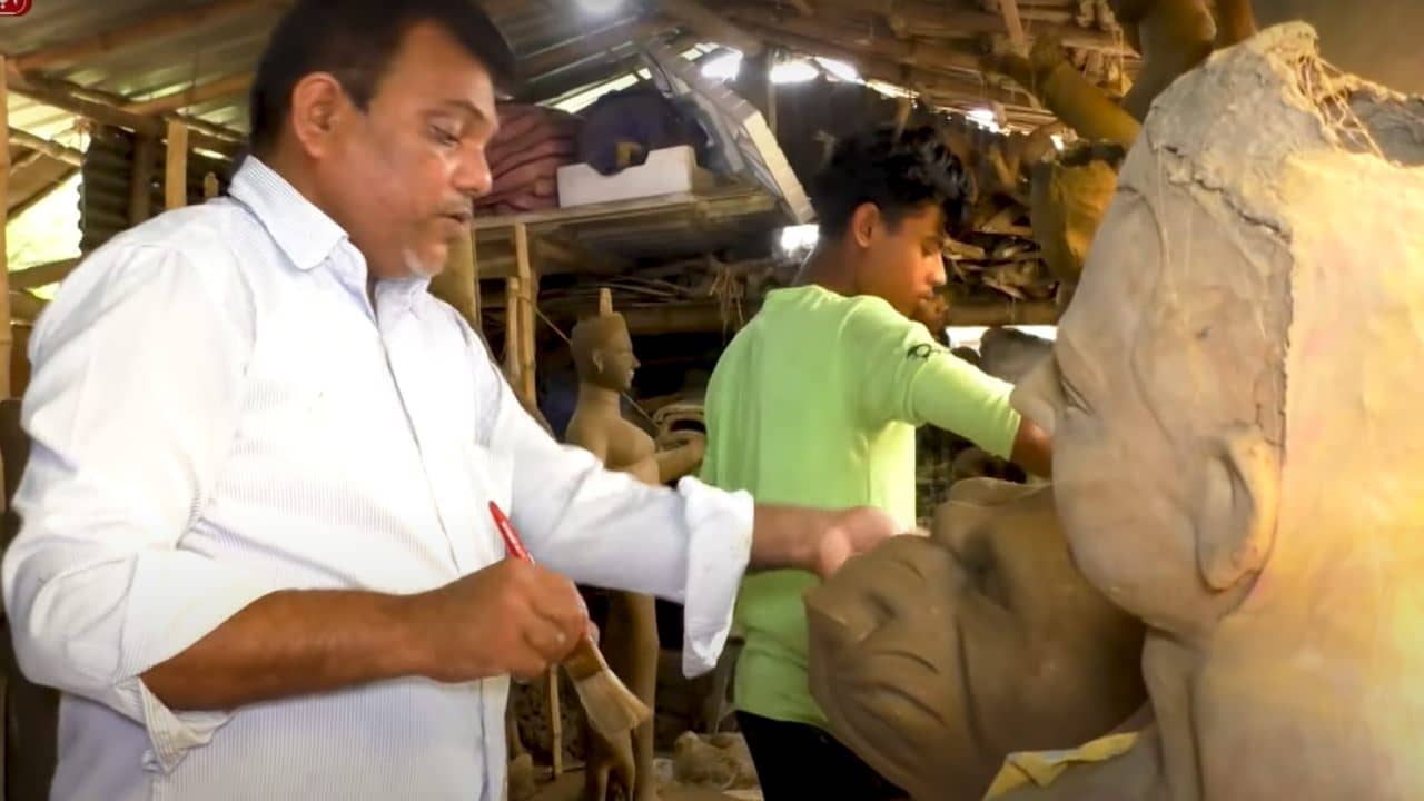 বাঁকুড়া শহরের পাঁচ বাঘা মোড় এলাকার একটি ওয়ার্কশপে পাঁচটি প্রতিমায় প্রাণ দিচ্ছেন প্রতিমা শিল্পী মহাদেব গঙ্গোপাধ্যায়। অর্থের অভাবে ছাড়তে হয়েছিল পড়াশোনা। তারপরই প্রতিমা গড়ার কাজে হাত দেওয়া। মহাদেব বাবু বলছেন, “উচ্চমাধ্যমিক পাশের পর আর আর্থিক অনটনের জন্য পড়াশোনা হয়নি। তারপরই এই কাজে হাতেখড়ি।” পাশে দাঁড়িয়েছেন স্ত্রী অনুপমা গঙ্গোপাধ্যায়। তিনি বলছেন, এটা আমাদের পেশা ও নেশা দুই। এটা এটা না করলে তো পেটও চলবে না।