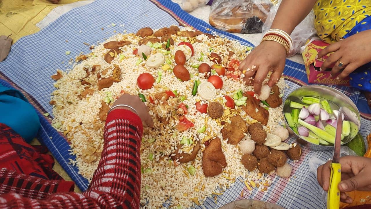 পাহাড়ের আকার নিতে পারে এই মুড়ি মেলায় আনা মুড়ি। সঙ্গে কেউ আনেন সন্দেশ, নাড়ু, রসগোল্লা, হরেক কিসিমের মিষ্টি, জিলাপি। কেউ আবার চপ, বেগুনি, টমেটো, মূলা, শশা, লঙ্কা,পেঁয়াজ, ঘুগনি, নারকেল নিয়ে আসেন। নদের চরে গামছা বা প্লাস্টিক পেতে বসে গুছিয়ে গল্প আর মুড়ি খাওয়ার সে যে কী আনন্দ, যাঁরা এ মেলায় যান তাঁরাই জানেন। বছরভর একা একা পড়ে থাকা দ্বারকেশ্বরের এই সঞ্জীবনী ঘাটে এদিন যেন মিলনমেলা বসে।