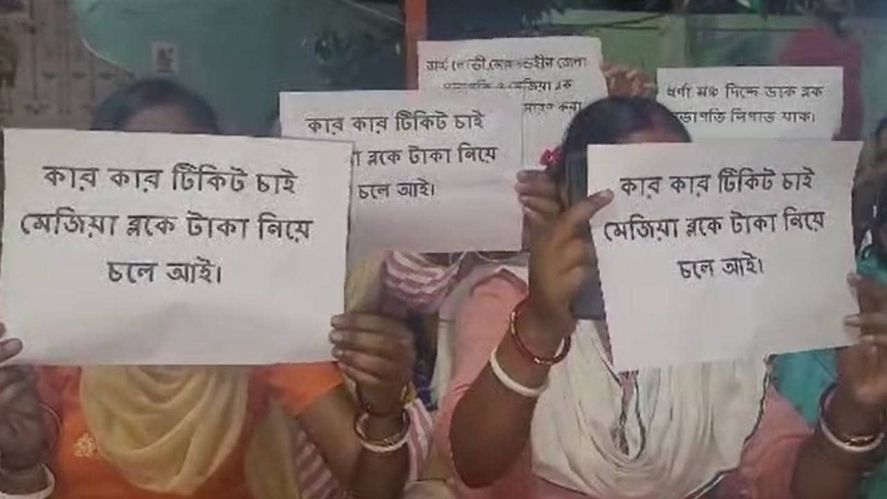মেজিয়া: পঞ্চায়েত ভোটের দামামা বেজে উঠেছে। শাসক থেকে বিরোধীরা সকলেই প্রস্তুত হচ্ছে গ্রাম বাংলা দখলের লড়াইয়ের জন্য। এই পরিস্থিতিতেই রাজ্যের বিভিন্ন প্রান্ত থেকে সামনে আসছে তৃণমূলের গোষ্ঠীদ্বন্দ্বের চিত্র। এ বার টাকার বিনিময়ে পঞ্চায়েতের টিকিট বিক্রির অভিযোগ তুলে দলীয় নেতৃত্বের বিরুদ্ধে সরব তৃণমূলেরই একাংশ। ব্লক সভাপতির বিরুদ্ধে টিকিট বিক্রির অভিযোগে রবিবার ধর্নাও দিয়েছে তৃণমূলের ওই বিক্ষুব্ধ গোষ্ঠী। রবিবার সন্ধ্যার এই ঘটনায় ব্যাপক চাঞ্চল্য ছড়াল বাঁকুড়া জেলার মেজিয়া এলাকায়। পঞ্চায়েতে টিকিটের জন্য এক লক্ষ টাকা এবং পঞ্চায়েত সমিতির টিকিটের জন্য ২ লক্ষ করে টাকা নেওয়ার অভিযোগ উঠেছে মেজিয়ার স্থানীয় তৃণমূল নেতৃত্বের বিরুদ্ধে।