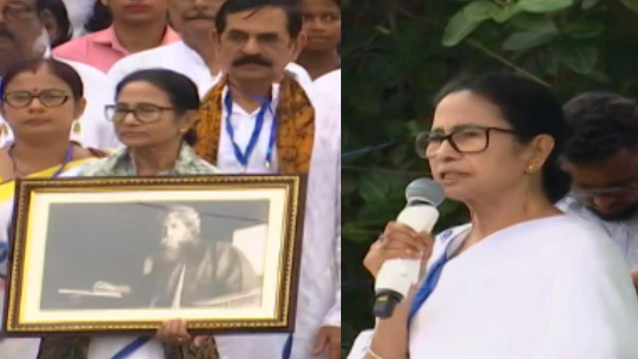 বোলপুর: “কী করে ভুলে গেলেন ঈশ্বরচন্দ্র বিদ্যাসাগরের কথা? কী করে ভুলে গেলেন মাতঙ্গিনী হাজরার কথা? কী করে ভুলে গেলেন দেশবন্ধুর কথা? কী করে ভুলে গলেন নব জাগরণের কথা?” রবিভূমে ভাষা আন্দোলনের মঞ্চ থেকে এ ভাষাতেই বাঙালি হেনস্থার প্রতিবাদে সরব হলেন মুখ্যমন্ত্রী মমতা বন্দ্যোপাধ্যায়। শান্তিনিকেতনের বুকে দাঁড়িয়ে বারবার মনে করালেন কবিগুরু রবীন্দ্রনাথ ঠাকুরের দর্শনের কথা।