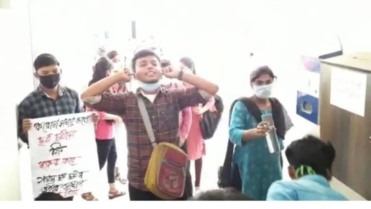 বর্তমান করোনা আবহে বিএ এবং এমএ শিক্ষাবর্ষে ভর্তির ফি-সহ সমস্ত ফি মকুবের দাবিতে রেজিস্টারের ঘরের সামনে অবস্থান বিক্ষোভে বসেন পঞ্চানন বর্মা বিশ্ববিদ্যালয়ের ‘ফি প্রতিরোধী ছাত্র কমিটি’।