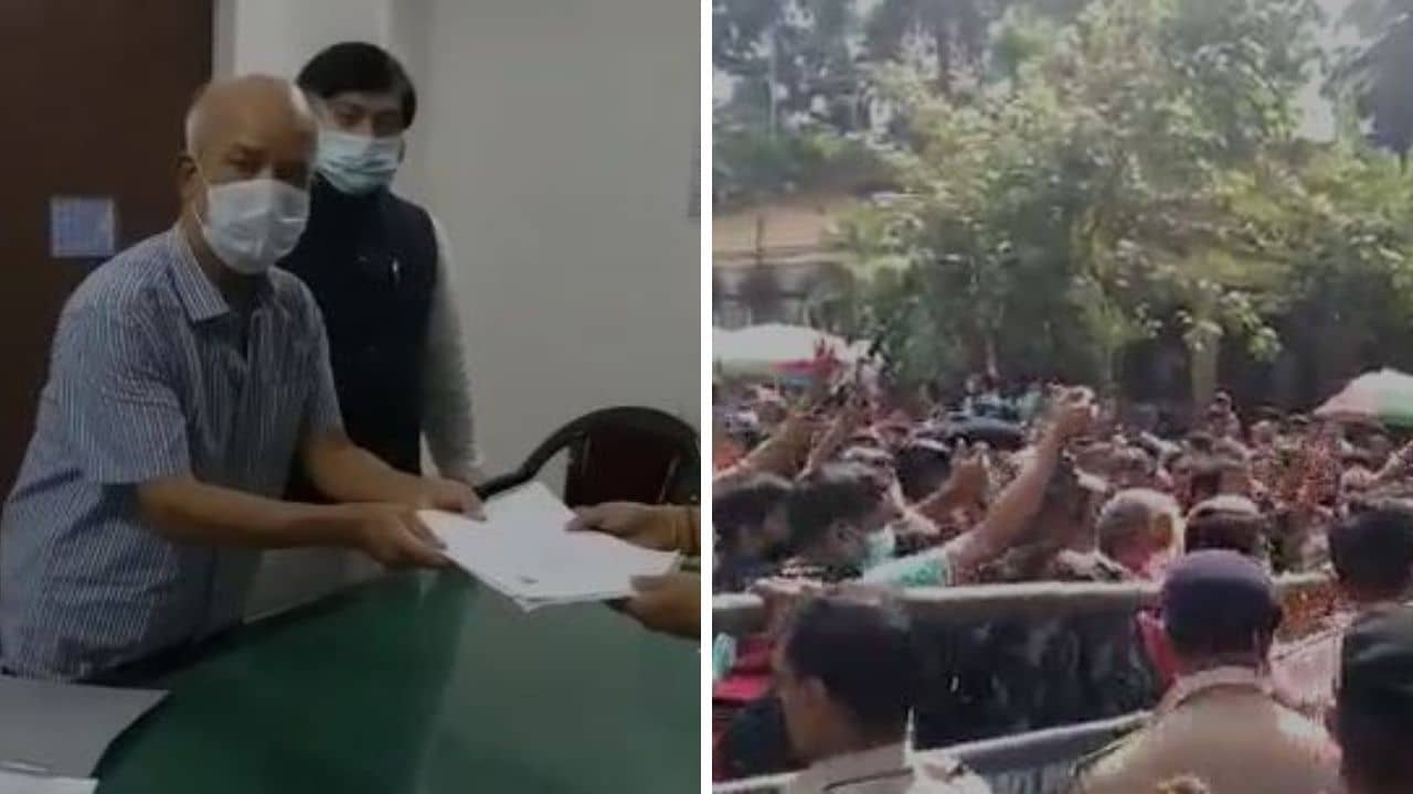 জেলা সভানেত্রী মালতী রাভা, বিধায়ক নিখিল রঞ্জন দে ও কেন্দ্রীয় প্রতিমন্ত্রী নিশীথ প্রামাণিকের সঙ্গে শুক্রবার মনোনয়ন জমা দিতে যান বিজেপি প্রার্থী অশোক মণ্ডল। কিন্তু মনোনয়ন জমা দেওয়ার আগেই বিপত্তি। আচমকা, তাঁদের ঘিরে ধরে বিক্ষোভ দেখাতে শুরু করেন তৃণমূল (TMC) কর্মী সমর্থকেরা অভিযোগ এমনটাই। বিক্ষোভের মধ্যেই ওঠে ‘জয় বাংলা’ স্লোগান।