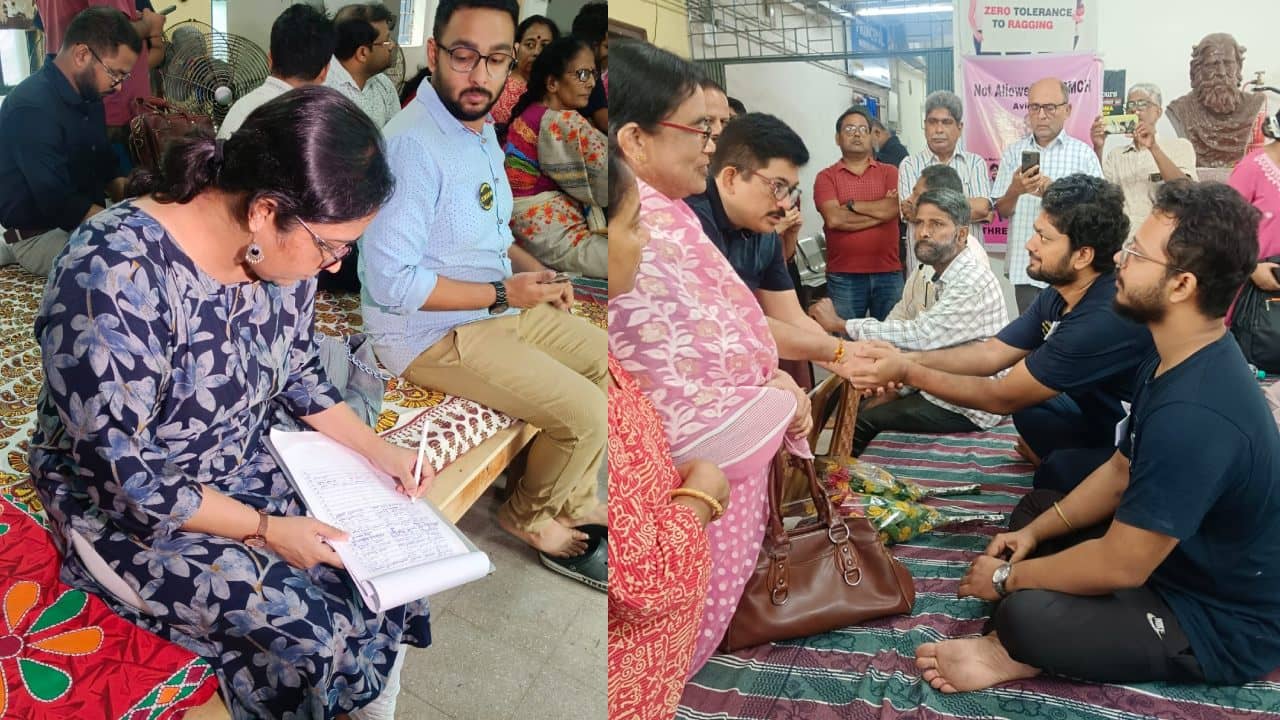 শিলিগুড়ি: উত্তরবঙ্গ মেডিক্যালের অনশনের ৭২ ঘন্টা পার। বৃষ্টির জেরে মঞ্চ বদল করে এবার অধ্যক্ষের চেম্বারের বাইরে চলছে অনশন। এদিন সকাল থেকেই গণ ইস্তফা সিনিয়র চিকিৎসকদের। অনশনকারীদের সঙ্গে দেখা করলেন গণতান্ত্রিক মহিলা সমিতি (সিপিএমের মহিলা সমিতি) নেতৃত্ব। তাঁদের দাবি মানুষ পরিচয়ে এসেছি। সহমর্মিতা জানাচ্ছি।