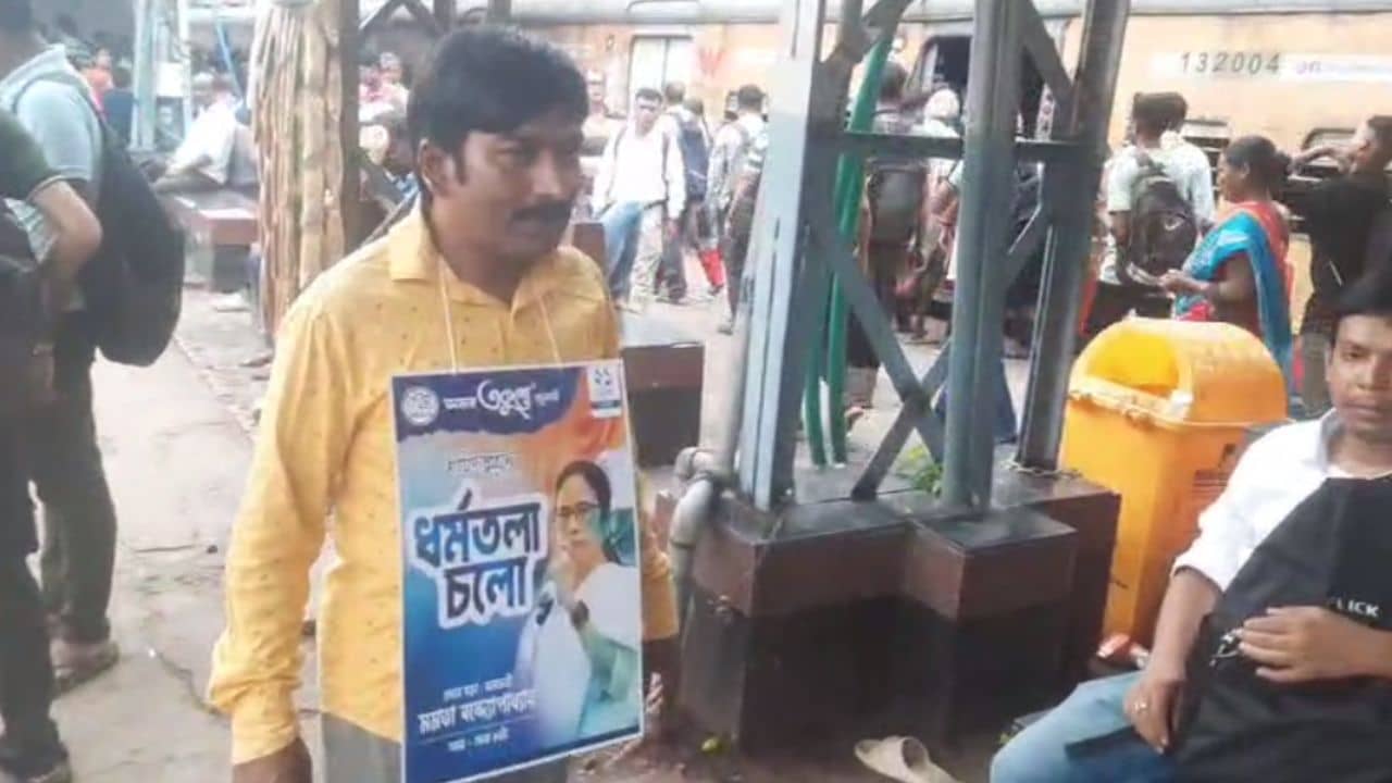 হুগলির বাসিন্দা ভাই দাস। ট্রেনে হকারি করেন। সকালে কয়েক ঘণ্টা হকারি। তারপর গলায় প্লাকার্ড ঝুলিয়ে ২১ জুলাইয়ের প্রচার চালিয়ে যাচ্ছেন। আপাতত ১০ জুলাই থেকে ২০ জুলাই পর্যন্ত এই কাজ চালিয়ে যাবেন তিনি। এই ভাই দাস-ই একসময় ব্যান্ডেল থেকে হাওড়া সব স্টেশনের নাম দিয়ে ছড়া লিখে বই ছাপিয়ে ছিলেন। এমনকী, ‘একাই একশো মমতা’ লিখে নিজেই ট্রেনে বিক্রি করেন।