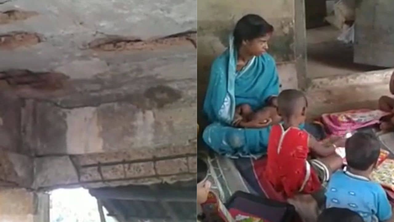 খানাকূল: ছোট-ছোট শিশুরা বসে পড়াশোনা করছে। ঠিক তার উপরে তাকালে আঁতকে উঠতে হয়। ছাদ থেকে চাঙর খসে পড়ছে। ঝুলছে লোহার খাঁচা। আর নীচে বসে ক্লাস করছে ছোট শিশুরা।