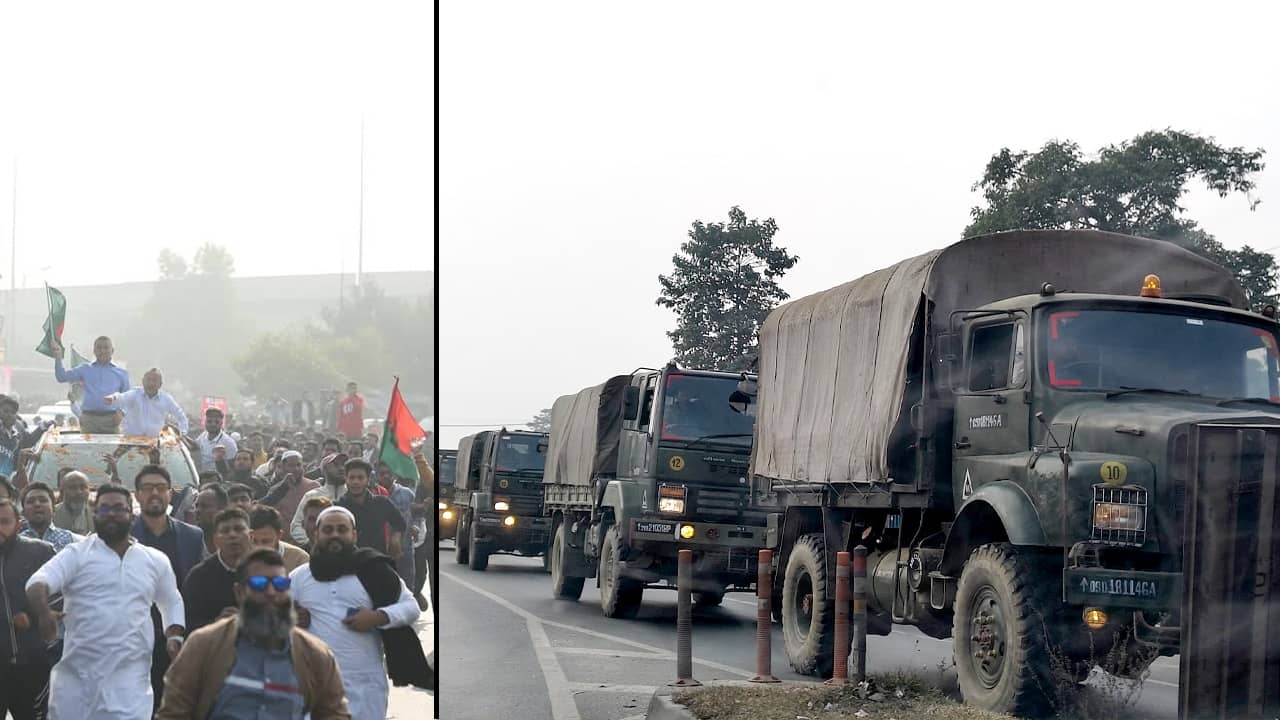 শিলিগুড়ি: দ্রুত গতিতে ছুটছে ভারতীয় জওয়ানদের গাড়ি। কোথায় যাচ্ছেন তাঁরা? এই প্রশ্নই যখন মাথাচাড়া দিচ্ছে, জলপাইগুড়ি ধূপগুড়ি এলাকার বাসিন্দারা তখন জানালেন গাড়িগুলি রওনা দিয়েছে সীমান্তের দিকে। আসলে বিএনপির তরফে ডাক দেওয়া হয়েছে লং-মার্চের। আগরতলা সীমান্তে সেই মতো এগোচ্ছে বাংলাদেশি লোকজন। কোনও রকম উত্তেজনা এড়াতে তৎপর ভারতীয় সেনা। একের পর এক সেনাবাহিনীর গাড়ি সারি দিয়ে যাচ্ছে সেভেন সিস্টারের (অসম,ত্রিপুরা, মণিপুর,মেঘালয়, নাগাল্যান্ড,অরুণাচল প্রদেশ, মিজোরাম) পথে।