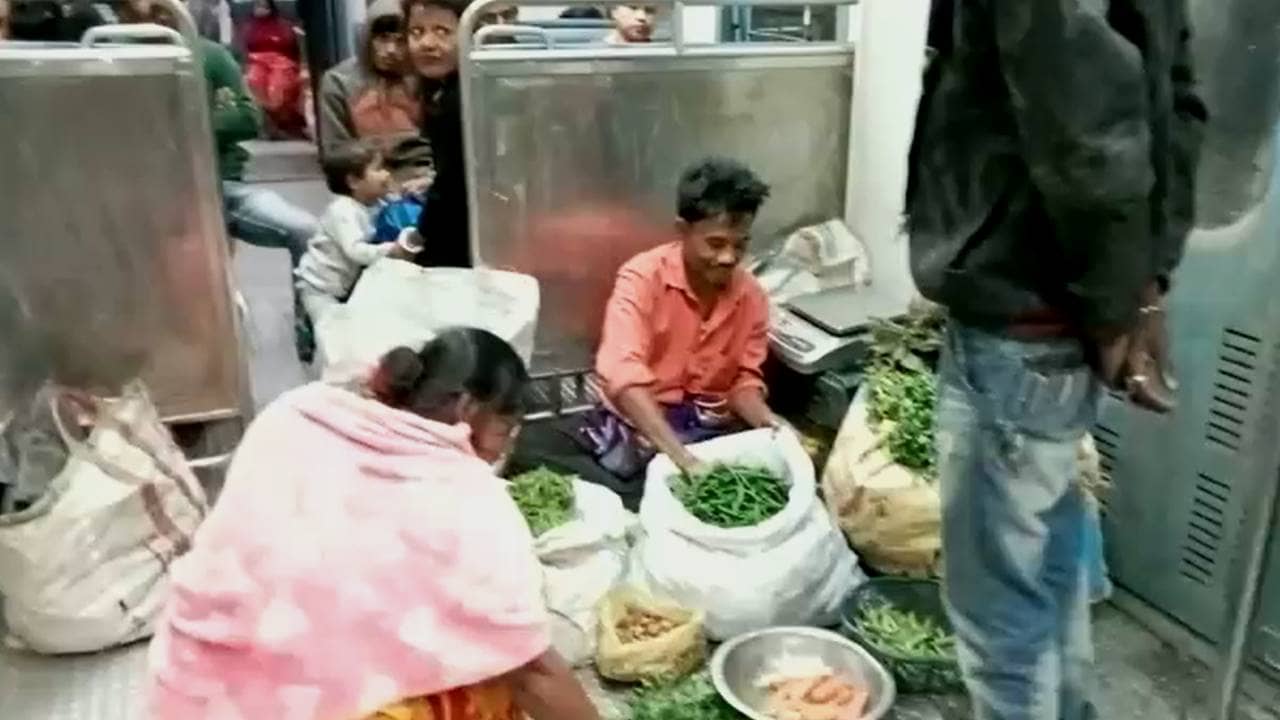 জলপাইগুড়ি: অফিস হোক বা স্কুল-কলেজ, ব্যবসায়িক প্রয়োজন হোক বা ভ্রমণ। আজও দেশের একটা বড় অংশের মানুষ তাঁদের পছন্দের গণপরিবহণের মাধ্যম হিসাবে ট্রেনকেই (Train) বেছে নেন। ভারত সরকারের যাত্রী পরিবহন ব্যবস্থার অন্যতম মাধ্যম ট্রেন। কিন্তু সেই ট্রেনেই যদি বাজার বসে যায় তা হলে কী হতে পারে? এমনটা শুনে চোখ কপালে উঠতেই পারে অনেকের। কিন্তু এমনই চিত্র ধরা পরেছে নিউজলপাইগুড়ি-হলদিবাড়ি প্যাসেঞ্জার ট্রেনে। বিষয়টি অনেকটা রথ দেখতে গিয়ে কলা বেচার মতো। ওই ট্রেনের বেশ কয়েকটি কামরার মধ্যেই বিভিন্ন প্রকার শাক থেকে শুরু করে ফুলকপি, বেগুন, মূলো, ধনেপাতা লংকা সহ বিভিন্ন সব্জি মিলছে চলন্ত ট্রেনে। আর যাত্রীরাও তা কিনছেন। সারাদিন অফিস করে বাড়ি ফেরার পথে আর বাজারে না গিয়ে ট্রেনেই বাজার সারছেন একাংশ যাত্রী। আবার অপরদিকে যাত্রীদের একাংশ আবার বিরোধী শিবিরে বসে এর প্রতিবাদও করছেন।