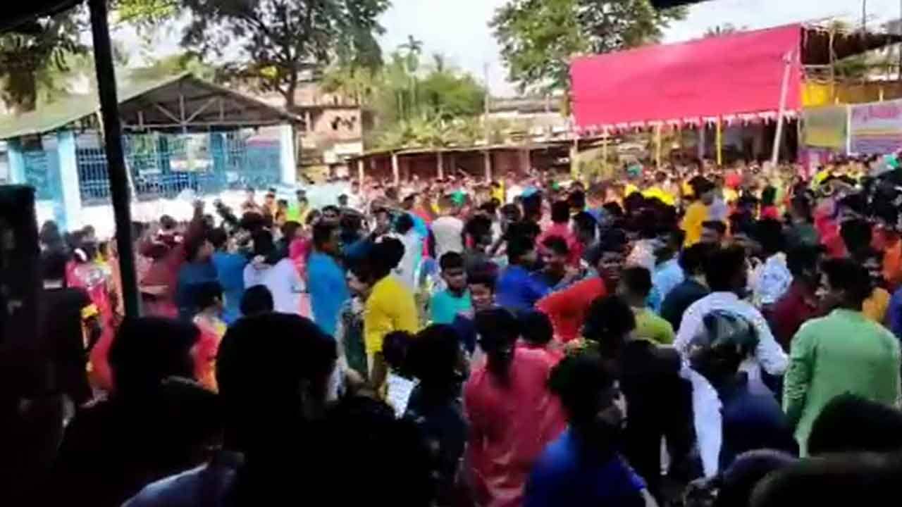 আংড়াভাসা বংশীবদন হাই স্কুলেও ধরা পড়ে একই চিত্র। ডিজে বক্স বাজিয়ে চলে নাচ। সেখানেও অধিকাংশ মানুষের মুখে মাস্ক ছিল না।