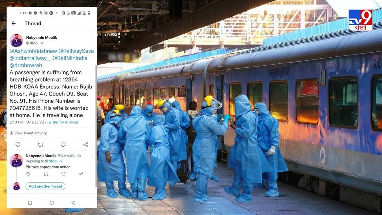 জলপাইগুড়ি: উপস্থিত বুদ্ধি খাটিয়ে রেল মন্ত্রীকে (Rail Minister) ট্যাগ করে টুইট করেছিলেন সমাজসেবী। তাঁর টুইট পেয়ে দ্রুত চিকিৎসার ব্যবস্থা করল রেল দফতর (Indian Railway)। রেলের পরিষেবা পেয়ে অভিভূত পরিবারের সদস্যরা। ধন্যবাদ জানালেন ভারতীয় রেলকে। সূত্রের খবর, বুধবার সকালে জলপাইগুড়ি স্টেশন থেকে হলদিবাড়ি-কলকাতা সুপার ফাস্ট এক্সপ্রেসের D-9 কামড়ায় চেপে একাই কলকাতা যাচ্ছিলেন জলপাইগুড়ি ৪ নম্বর ঘুমটি এলাকার বাসিন্দা রাজীব ঘোষ (৪৫)। গত কয়েকদিন ধরে তিনি সর্দি-কাশিতে ভুগছিলেন বলে জানা যায়। যা নিয়ে চিন্তায় ছিল গোটা পরিবারও। ট্রেন মালদা স্টেশন ছাড়ার পর আচমকা তাঁর প্রচণ্ড শ্বাসকষ্ট শুরু হয়।