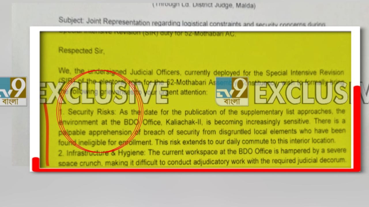 শুধু তাই নয়, TV9 বাংলার হাতে যে এক্সক্লুসিভ চিঠি এসেছে, তাতে লেখা, “কালিয়াচক ২ নম্বরের বিডিও অফিসের পরিবেশ ক্রমশ স্পর্শকাতর হয়ে উঠছে। স্থানীয় লোকজন, যাঁদের নাম বাদ পড়েছে, তারা হামলা করতে পারে, নিরাপত্তা বিঘ্নিত হতে পারে। আমাদের প্রতিদিনের যাতায়াত করার পথে নিরাপত্তা নিয়ে আশঙ্কা তৈরি হচ্ছে।” প্রায় ৫৪ কিলোমিটার রাস্তা পার করে তাঁদের যেতে হত বলে জানিয়েছেন ওই বিচারকরা। সাতজনই ওই চিঠি লেখেন জেলাশাসককে।
