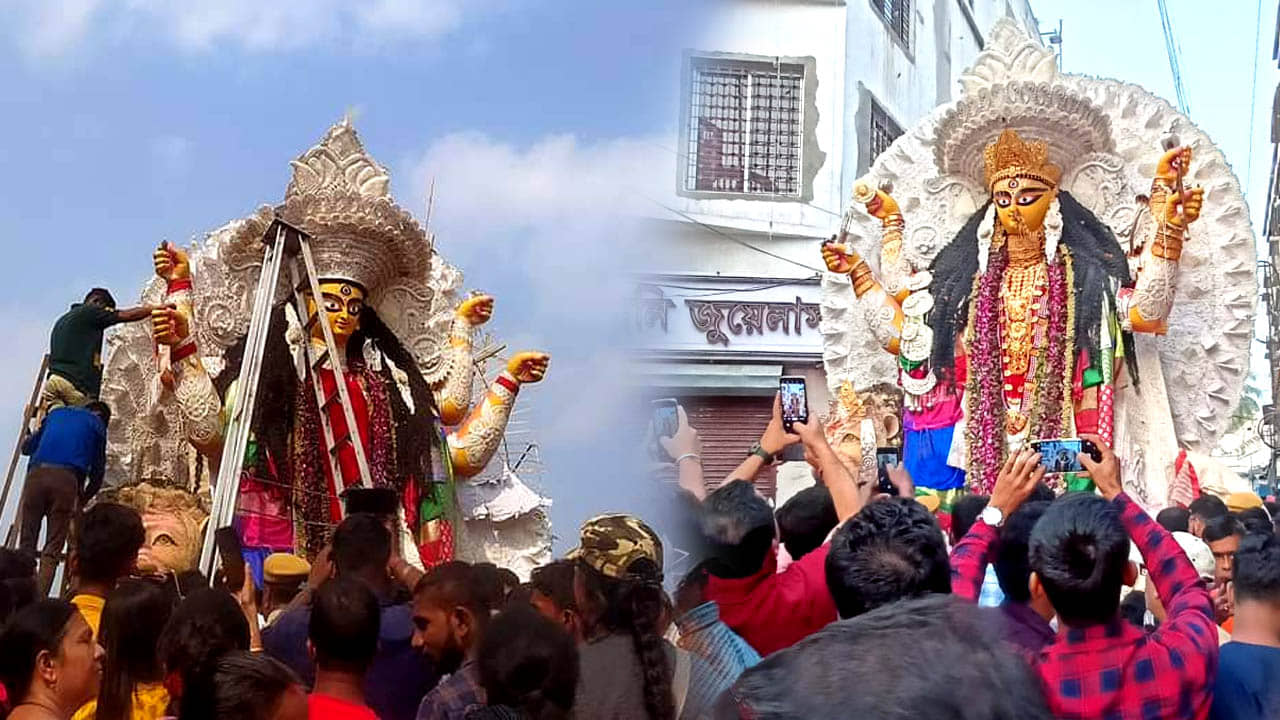 বেজেছে বিদায় ঘণ্টা। দশমী থেকেই বিষাদের সুর কৃষ্ণনগরে (Krishnanagar)। তবে এখনও যেন উৎসবের রেশ কাটেনি। একাদশীতেও দেখা গেল সেই ছবি। সারা শহর জুড়ে প্রায় ছোট বড় মিলিয়ে প্রায় ২৫০ টি পুজো হয়। তারমধ্যে চাষাপাড়ার বুড়িমার (Jagaddhatri Puja in Krishnanagar) পুজো সবচেয়ে প্রাচীন।