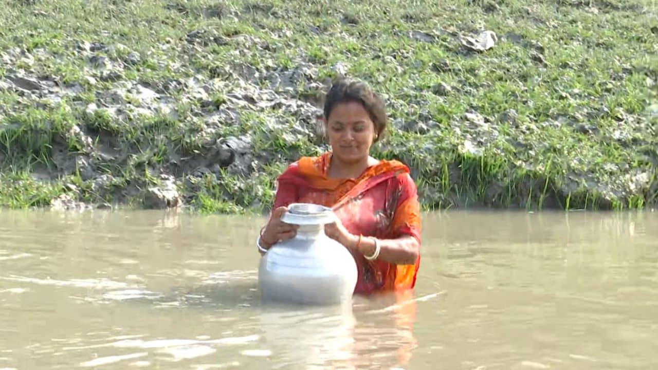 দুর্গামণ্ডপের খালপাড়া উত্তর ২৪ পরগনা আর রাধানগর দক্ষিণ ২৪ পরগনায়। মাঝে নদী। কলসি নিয়ে সাঁতরে পাড় করতে হয়। শাড়ি পরে, মাথায় গোমটা টেনে, কোলে কলসি-এইভাবে সিক্ত বদনে যেতে হয় অন্য জেলাতেই। কেবল জল আনতে। সে ছবি ধরা পড়েছে TV9 বাংলার ক্যামেরায়।