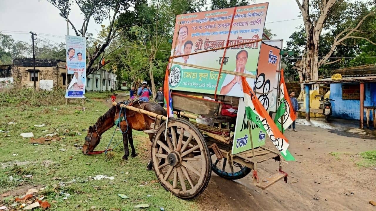 আসানসোল: আর তো কয়েকটা দিন। তার মধ্যেই রয়েছে পুর ভোট। আঁট-ঘাট বেঁধে শাসক বিরোধী প্রত্যেকে নেমেছে লড়াইয়ের ময়দানে। তবে অভিনবত্ব দেখা গেল তৃণমূলের ভোট প্রচারে। একবারে ঘোড়া ছুটিয়ে নেমে পড়েছেন প্রার্থী। নাহ! এ ঘোড়া কিন্তু অশ্বমেধের যজ্ঞের নয়, কুলটির ঘোড়া গাড়ি। কেউ বলেন টাঙা কেউ বা এক্কা গাড়ি। আর গাড়িকে সাজানো হয়েছে দলীয় পতাকা আর প্ল্যাকার্ডে। গ্রামে-গ্রামে ছুটছে সেই গাড়ি। গাড়িটির ভিতর বেজে উঠছে মাইক। আসানসোল পুরনিগমের ৭৪ নম্বর ওয়ার্ডে তৃণমূল প্রার্থী উজ্জ্বল চট্টোপাধ্যায়ের সমর্থনের প্রচারে দেখা গেল এরকম প্রস্তুতি।