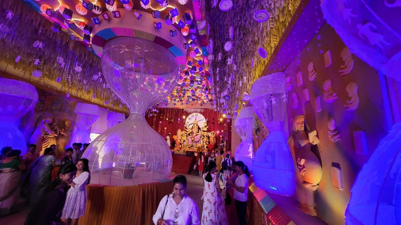 Durga Pujo 2023: মাতৃমূর্তির পিছনে ঘড়ি, সময়ের গুরুত্ব বোঝাল এই ক্লাব