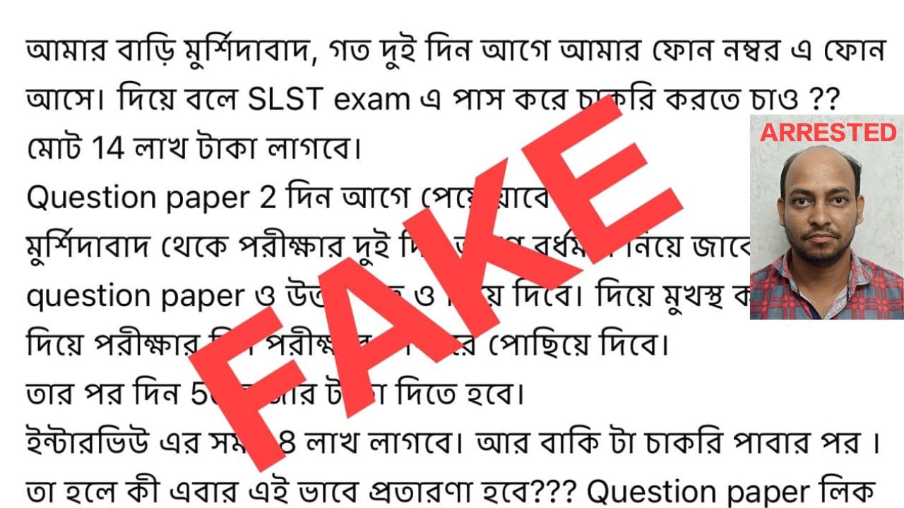 বিষয়টি নজরে আসার সঙ্গে সঙ্গে পশ্চিম মেদিনীপুর জেলা পুলিশ তদন্ত শুরু করে ও তদন্তে উঠে আসে যে ওই ব্যক্তির ঠিকানা পশ্চিম মেদিনীপুর জেলার চন্দ্রকোণা থানার মাংরুল গ্রাম পঞ্চায়েতে লোড়পুর গ্রামে। আগামী ৭ ও ১৪ সেপ্টেম্বর তারিখে অনুষ্ঠিত হতে চলা স্কুল সার্ভিস কমিশনের SLST পরীক্ষাকে সন্ধিহান ও কলুষিত করতে এবং সাধারণ মানুষ ও পরীক্ষার্থীদের মধ্যে প্রশাসন – সরকারি পরীক্ষা ব্যবস্থাকে সন্দেহজনক করে তোলার অপচেষ্টা করে। ওই ব্যক্তিকে শনাক্ত করে পুলিশি হেফাজতে নেওয়া হয়েছে ও প্রয়োজনীয় আইনানুগ ব্যবস্থা নেওয়া হচ্ছে।