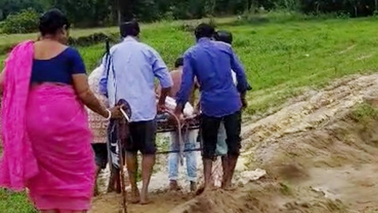 চন্দ্রকোনা: খাটিয়ায় রোগী। চারদিকে কয়েকজন ধরে হেঁটে চলেছেন। খুব সাবধানে হাঁটছেন। কারণ, তাঁদের পা-ও পিছলে যেতে পারে। গাড়ি তো দূর অস্ত। হেঁটে চলাও বিপজ্জনক। রাস্তার এই ছবি দেখলে বুক কেঁপে উঠতে পারে। ভিনরাজ্য নয়। এই ছবি বাংলার। খাটিয়ায় রোগীকে নিয়ে দেড় কিমি হেঁটে বাড়ি পৌঁছতে হল। রাস্তার বেহাল এই ছবি পশ্চিম মেদিনীপুর জেলার চন্দ্রকোনা দু নম্বর ব্লকের বসনছোড়া গ্রাম পঞ্চায়েত যদুপুর গ্রামের।