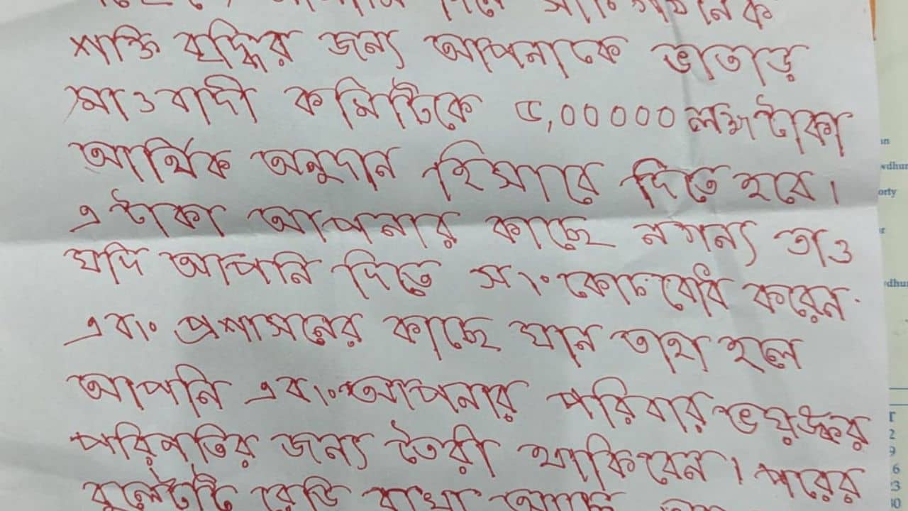 জানা গিয়েছে, পূর্ব বর্ধমানের ভাতাড় হাসপাতালের দন্ত চিকিৎসক অপর্ণা মুখোপাধ্যায়। চিকিৎসকের অভিযোগ, গতকাল তাঁর কাছে মাওবাদি কমিটির নাম করে হুমকি চিঠি আসে। সেখানে পাঁচ লক্ষ টাকা দাবি করা হয়। সেই টাকা না পেলে ওই চিকিৎসক ও তাঁর পরিবারকে প্রাণনাশের হুমকি পর্যন্ত দেওয়া হয়। লাল কালিতে লেখা হয়েছে চিঠিটি। সেখানে বলা হয়েছে, ‘মাওবাদী কমিটিকে অনুদান হিসাবে দিতে হবে পাঁচ লক্ষ টাকা। আর বিষয়টি যদি পুলিশের কাছে জানানো হয় ‘ভয়ঙ্কর’ পরিণতি হতে পারে। পরের বুলেটও তৈরি রয়েছে বলে লেখা হয়েছে সংশ্লিষ্ট চিঠিতে।