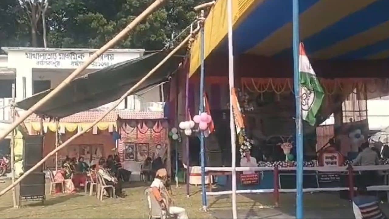 বৃহস্পতিবার থেকেই নতুন শিক্ষাবর্ষ শুরু হয়েছে। অথচ স্কুল খোলা অবস্থায় স্কুলের বাউন্ডারির ভিতরে তৃণমূলের নেতা নেত্রীদের ছবি দিয়ে বড় গেট বানিয়ে তারস্বরে চলছে দলের প্রতিষ্ঠা দিবস। গোটা স্কুল চত্বর জুড়ে লাগানো হয়েছে তৃণমূলের পতাকা। এই ঘটনা দেখে স্কুল পরিদর্শকের কাছে লিখিত অভিযোগ জানিয়েছে বিজেপি। স্কুলের প্রধান শিক্ষক বলেন, অনুষ্ঠানের জন্য আজ মিড ডে মিল হয়নি। স্কুল পরিচালন সমিতির সভাপতি অনুমতি দিয়েছেন। এদিকে, ক্ষোভ প্রকাশ করেছে বিজেপি। বিজেপির মণ্ডল সভাপতি ইন্দ্রজিৎ ঘোষ বলেন, ‘এসব দেখে বলতে ইচ্ছা করছে, তৃণমূলের চৈতন্য হোক।’