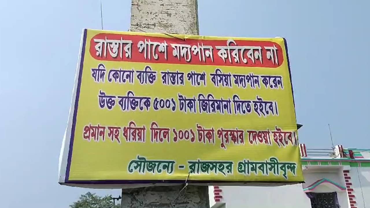 এই জাতীয় একাধিক পোস্টার দেখা যাচ্ছে পাঁশকুড়া মাইশোরা গ্ৰাম পঞ্চায়েতের রাজশহর গ্রামে। গ্রামবাসীরা বলছেন, রাস্তার পাশেই রয়েছে তাঁদের চাষের জমি। অভিযোগ, সেই জমিতে বসেই দিনের পর দিন ধরে মদ্যপান করে যাচ্ছে আশপাশের এলাকার কিছু যুবক। অনেক দূরদূরান্ত থেকেই ভিড় হচ্ছে মদ্যপদের। তাতেই অতিষ্ঠ গ্রামের লোকজন।