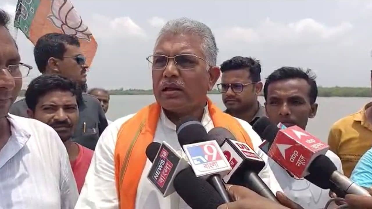 দিলীপ ঘোষ বলেন, “কাঁচা বালি, কাঁচা মাটি তুলে জেসিবি দিয়ে এখন বাঁধ তৈরি করা হচ্ছে। কেন্দ্রীয় সরকার প্রত্যেক বছর ৬০০ কোটি টাকা দেয় বাঁধ তৈরির জন্য। বছরে দুইবার, তিনবার সেই অস্থায়ী বাঁধ হয়। আবার একটি কোটাল এলে, বৃষ্টি এলে, সব ধুয়ে গর্তে পড়ে যাবে। এখানকার সাধারণ মানুষ বহু বছর ধরে এই বিপদ নিয়েই বেঁচে আছেন। একটা পয়সাও ক্ষতিপূরণ কাউকে দেওয়া হয় না। আয়লা, ইয়াস, আমফান… নাম লেখানো হয়, ফর্ম ফিল আপ হয়, কিন্তু পায় না। আমাদের লোকেরা এখানে পঞ্চায়েতে ডেপুটেশন দিয়েছিল বলে, ১৫০ লোকের নামে জামিন অযোগ্য ধারা দিয়ে তাঁদের বাড়ি ছাড়া করা হয়েছিল দেড় মাস। কেন্দ্রের টাকা সব লুঠ করে নেতারা দোতলা-তিনতলা বাড়ি করছে।”