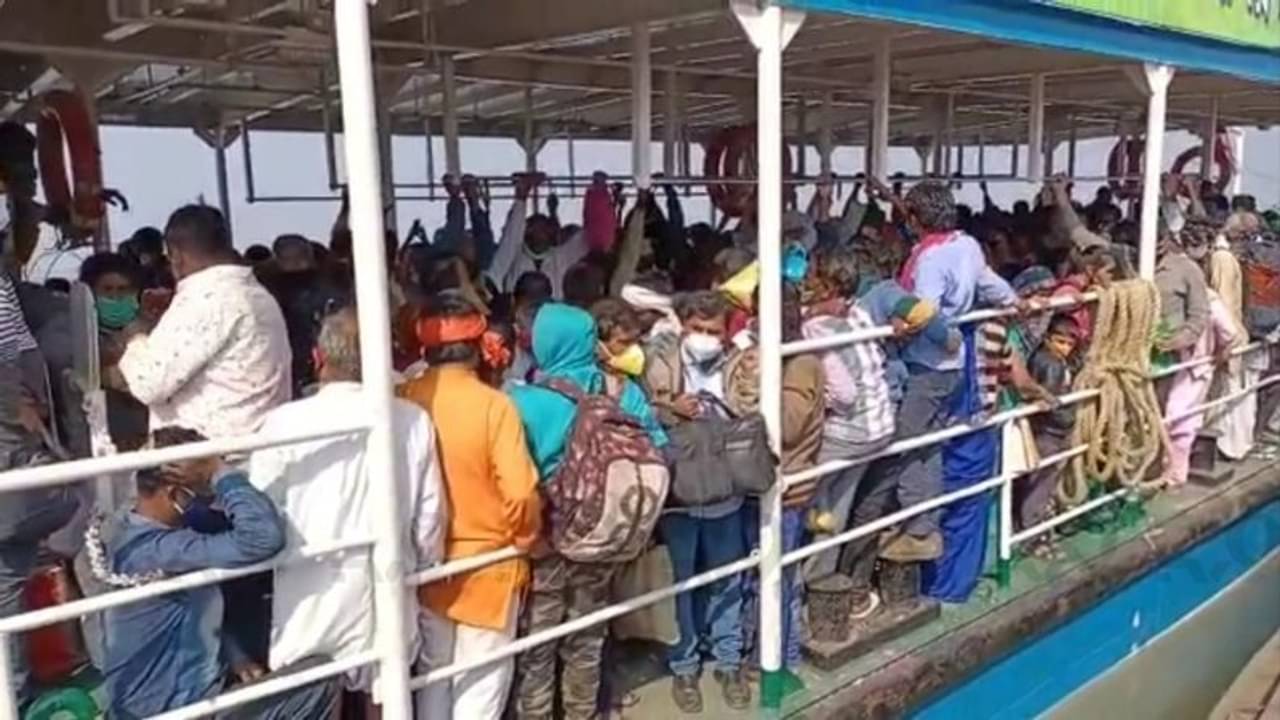 মেলা প্রাঙ্গন থেকে প্লট নম্বর ৮ জেটিঘাট, কচুবেড়িয়া জেটিঘাট, বিভিন্ন বাসস্ট্যান্ডে থিকথিক করছে ভিড়। উধাও হয়েছে দূরত্ববিধি। প্রায় জমায়েত করেই চলছে যাত্রা।
