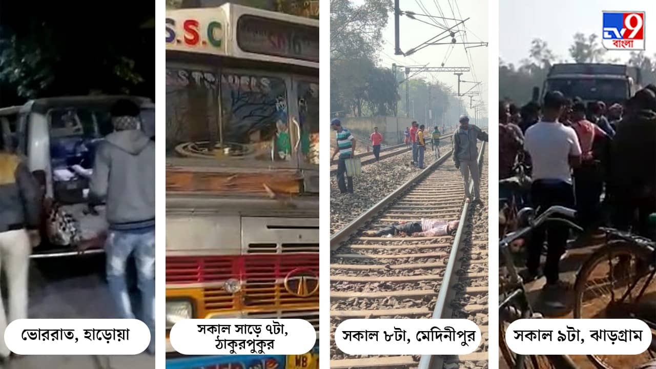 কলকাতা: সপ্তাহের শুরুতেই একাধিক পথ দুর্ঘটনা ঘটল রাজ্যের বিভিন্ন প্রান্তে। কোথাও নাইট ডিউটি সেরে বাড়ি ফেরার পথ বাসের চাকায় পৃষ্ট হলেন এক মহিলা। কোথাও মোবাইল কানে দিয়ে রেললাইন পেরনোর সময় ট্রেনের ধাক্কায় মৃত্যু হল ব্যক্তির। কোথাও আবার লরির ধাক্কায় মৃত্যু বাইকআরোহী। মধ্য রাতে দুটি গাড়ির মুখোমুখি সংঘর্ষের জেরে আহত হয়েছেন পাঁচ জন। আহতদের পরিস্থিতি আশঙ্কাজনক হওয়ায় তাঁদের স্থানান্তরিত করা হয়েছে কলকাতার হাসপাতালে। দুর্ঘটনায় মৃতদের দেহ উদ্ধার করে ময়নাতদন্তের জন্য পাঠিয়েছে পুলিশ। ঘাতক বাসের চালককে আটক করা হয়েছে।