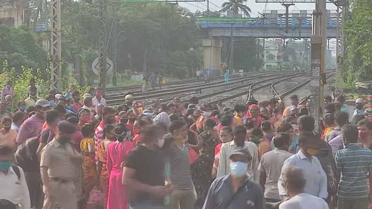 ঘড়ির কাঁটায় তখন ৭ টা। শিয়ালদা-ডায়মন্ডহারবার লোকাল সোনারপুর স্টেশনে (Sonarpur) এসে পৌঁছয়, তখন নিত্য যাত্রীরা ট্রেনে ওঠার চেষ্টা করেন। ট্রেনের সামনেই বসে পড়ে বিক্ষোভ দেখান তাঁরা। এক যাত্রী বললেন, “দিদির কাছে অনুরোধ ট্রেন চালালে সব চলুক, না হলে কোনও ট্রেনই চলবে না। কিছু লোক যেতে পারছেন, কিছু পারছেন না। এইভাবে পেটে কতদিন ভাত জোগাতে পারব!”